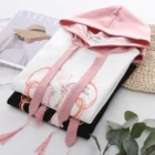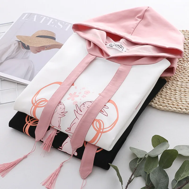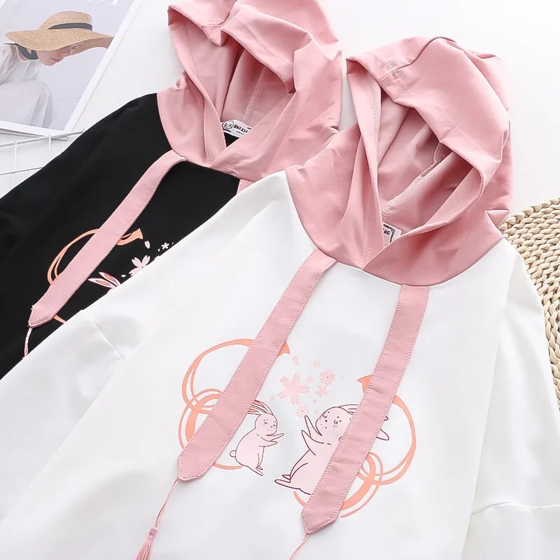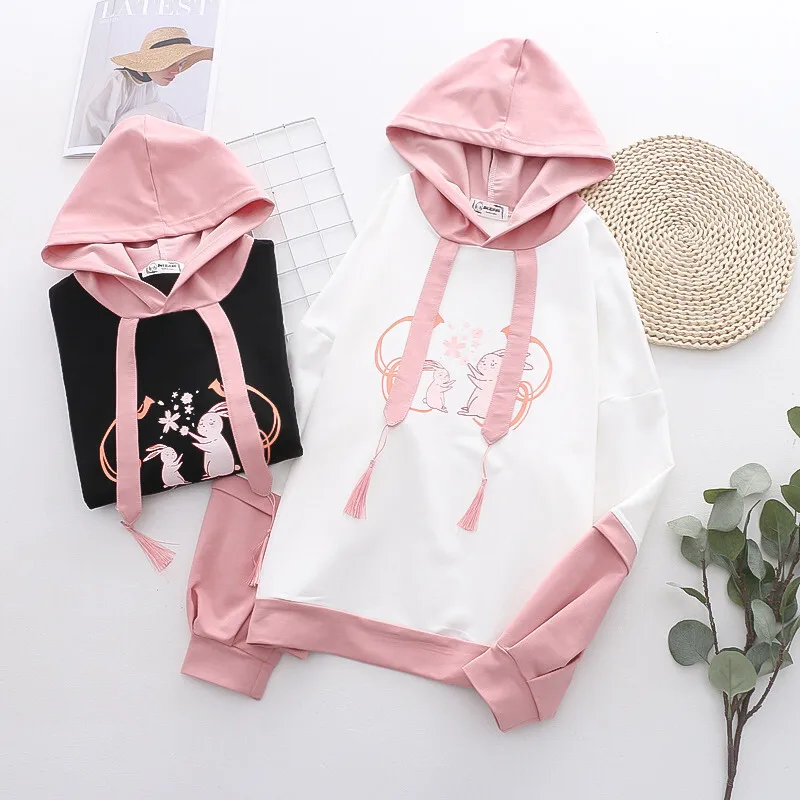 Embrace kawaii perfection with this absolutely enchanting hoodie featuring the sweetest sakura bunnies in a dreamy pink and white colorway! Available in both classic white and edgy black, each hoodie showcases adorable bunny characters surrounded by delicate cherry blossoms with gold metallic accents that catch the light beautifully. The color-blocked design with soft pink sleeves and hood creates that perfect harajuku street style silhouette while the charming tassel drawstrings add that extra touch of playful Japanese fashion flair.