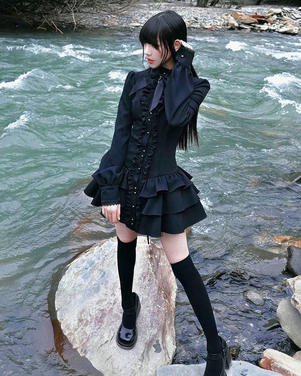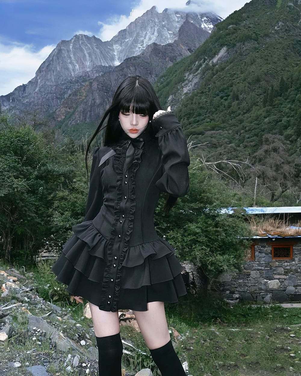 Embrace your dark romantic side with this absolutely stunning black gothic lolita dress that perfectly captures Victorian elegance with kawaii charm! Featuring dramatic ruffle layers cascading down the skirt and an enchanting lace-up corset front with ornate button details, this piece delivers that coveted gothic princess aesthetic. The romantic puff sleeves with delicate ruffle cuffs and the tiered skirt design create the most ethereal silhouette while the premium black fabric adds that mysterious allure every gothic fashion lover adores.