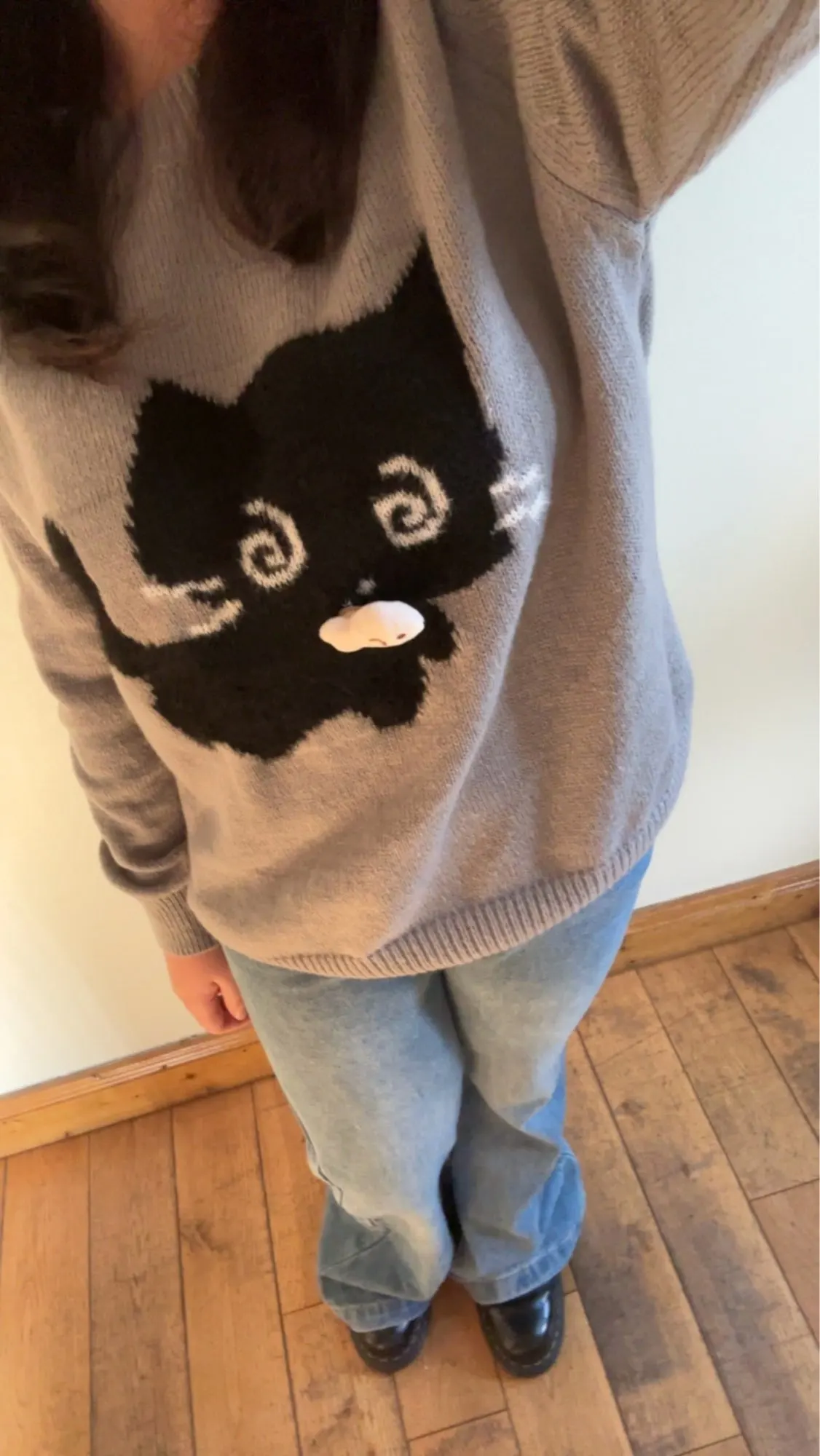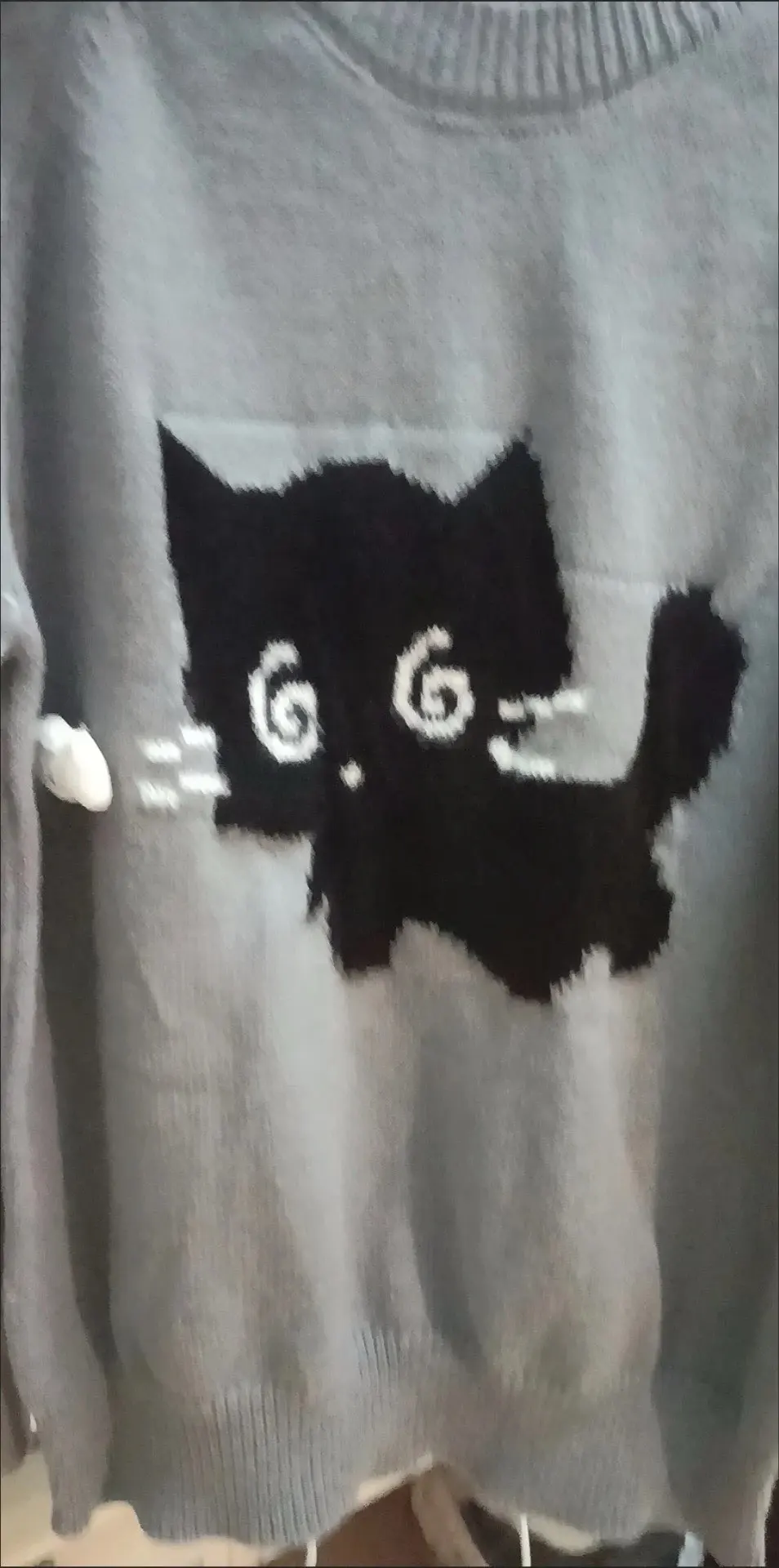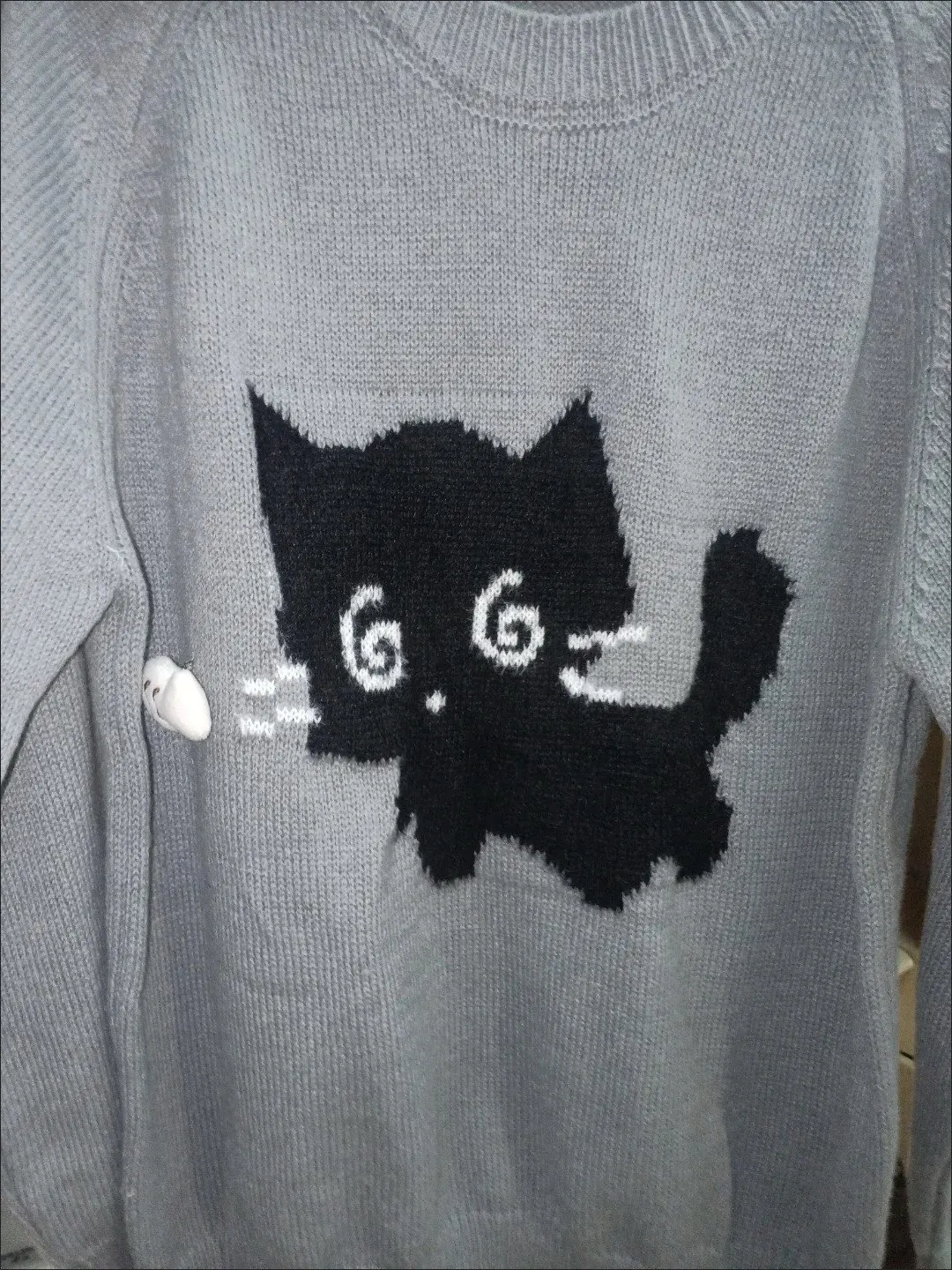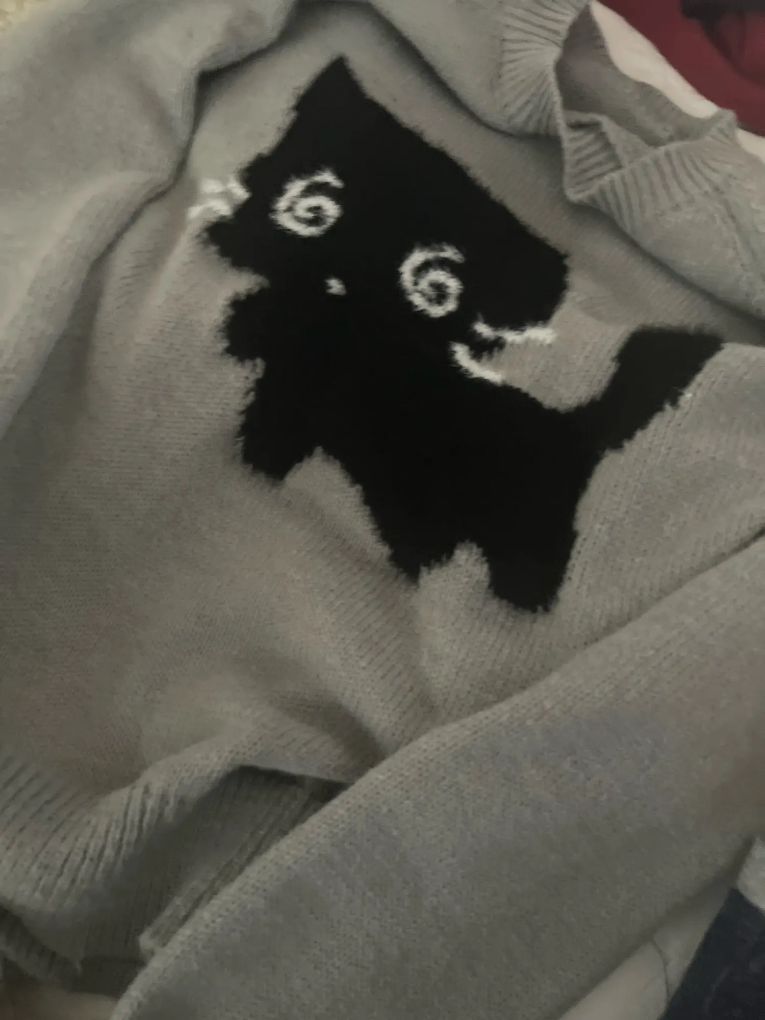 Add a dash of playful mystery to your wardrobe with this charming charcoal grey knit. Featuring a soft, flocked black cat with dazed spiral eyes and a tiny fish detail, this sweater captures a perfect balance of vintage character and modern cutecore charm.