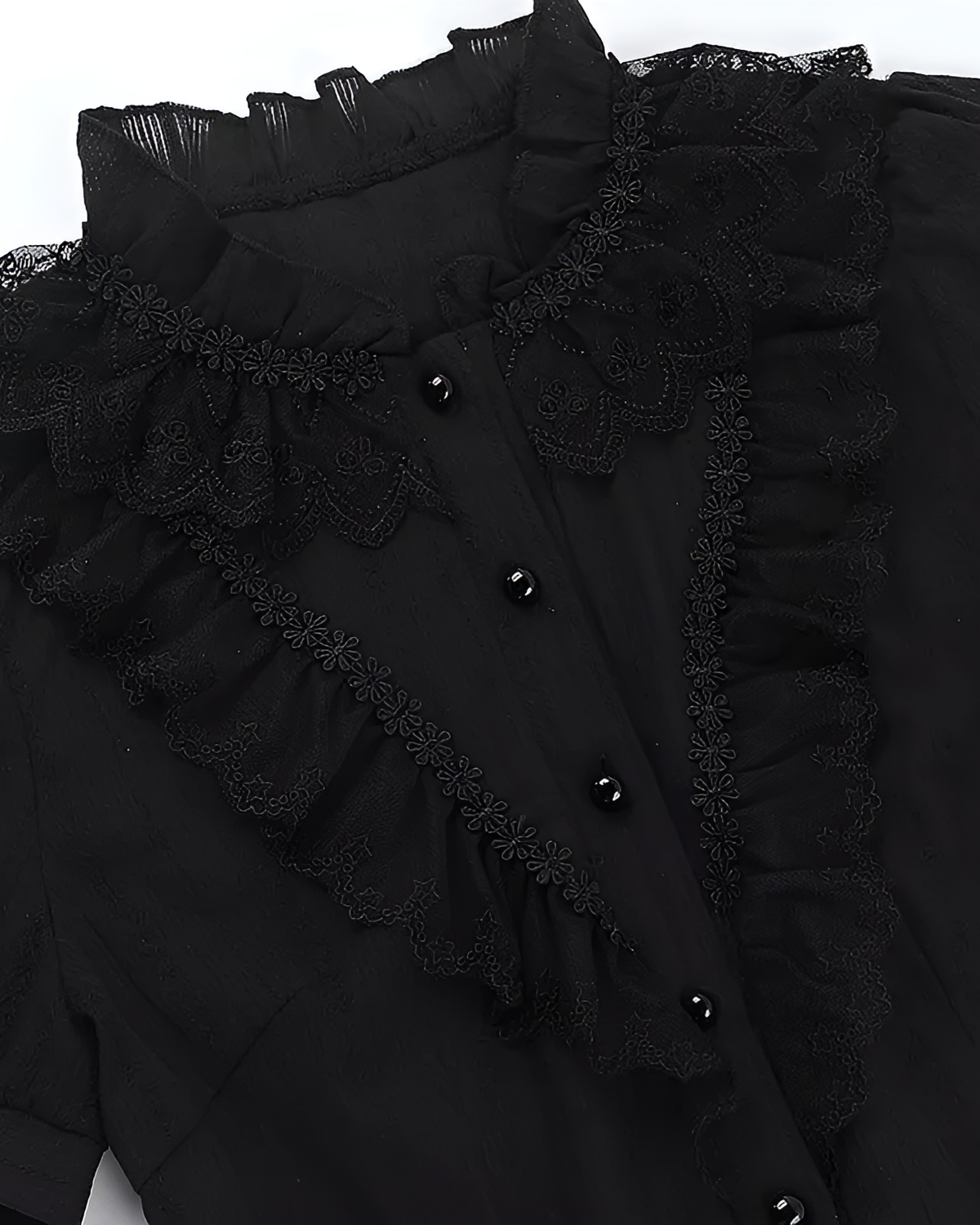 Stop staring at your screen and start dressing like you belong in a dark fantasy novel. This Black Ruffled Blouse – Gothic Aesthetic makes office existential dread look intentional.