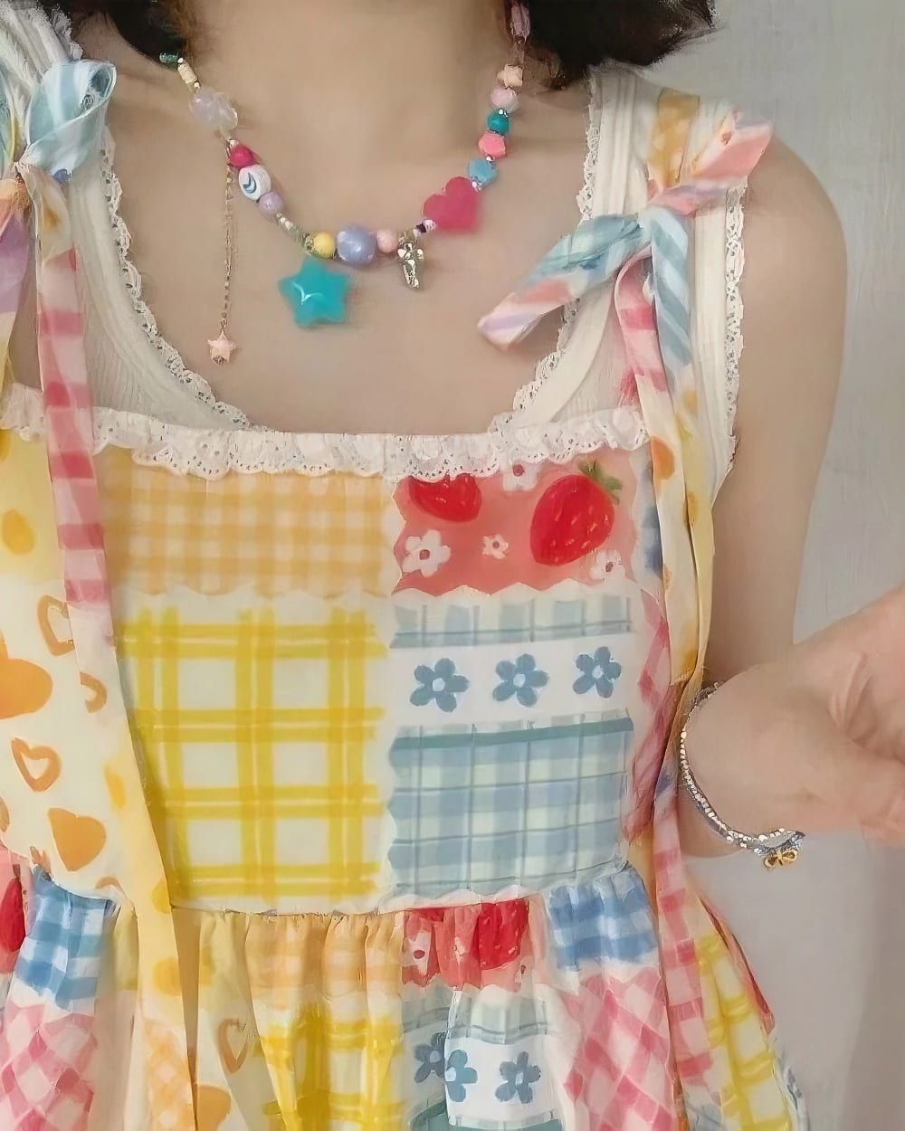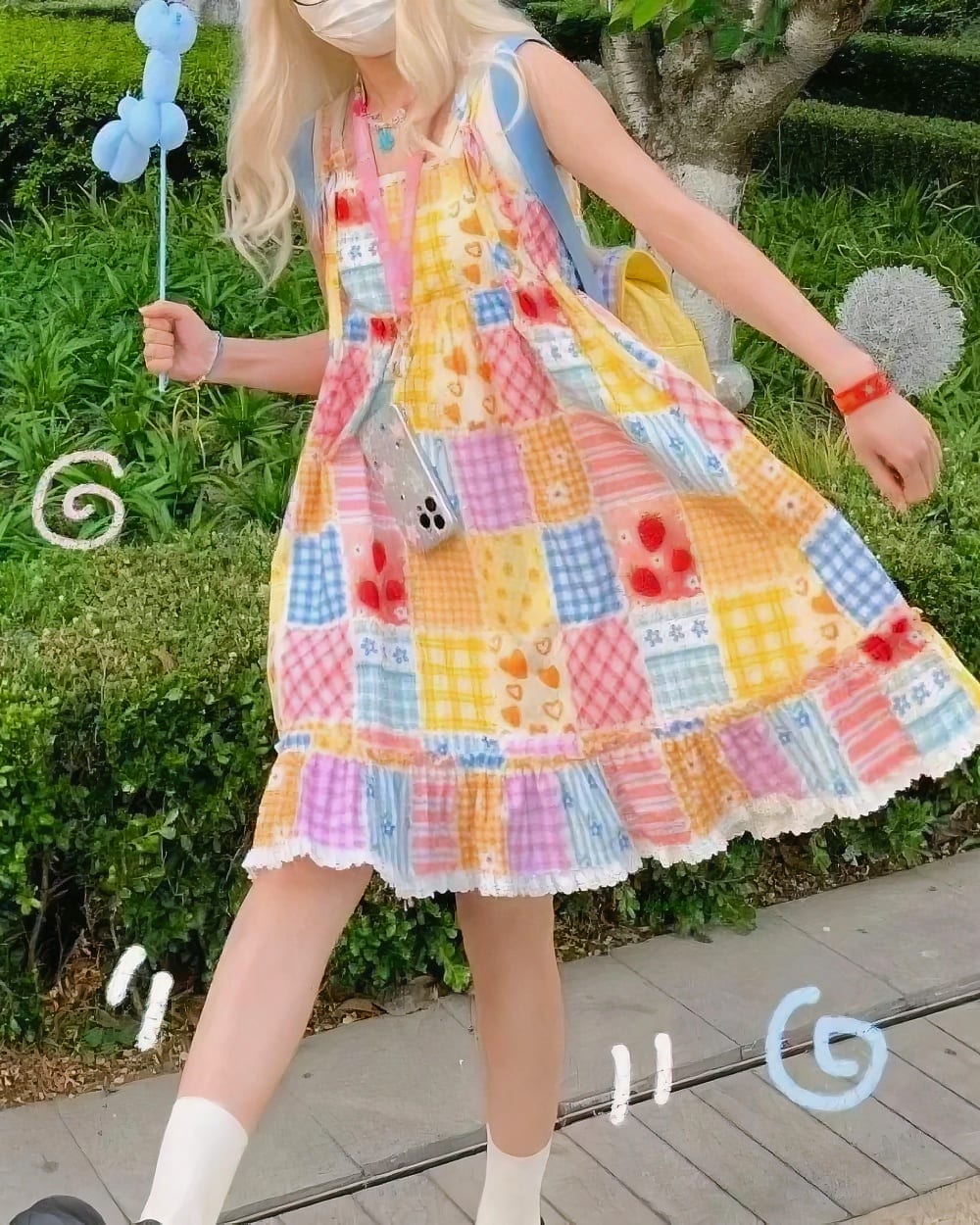 Step into a rainbow dream with this absolutely enchanting patchwork dress that perfectly captures the whimsical jojifuku aesthetic! Featuring an adorable mix of pastel gingham patterns in sweet candy colors with charming fruit and cherry motifs scattered throughout, this piece brings that coveted Japanese girly style to life. The flowing midi length with delicate ruffle hem trim creates the most feminine silhouette while the sleeveless design makes it perfect for layering with cardigans and creating those dreamy fairy kei coordinates every jojifuku lover adores.