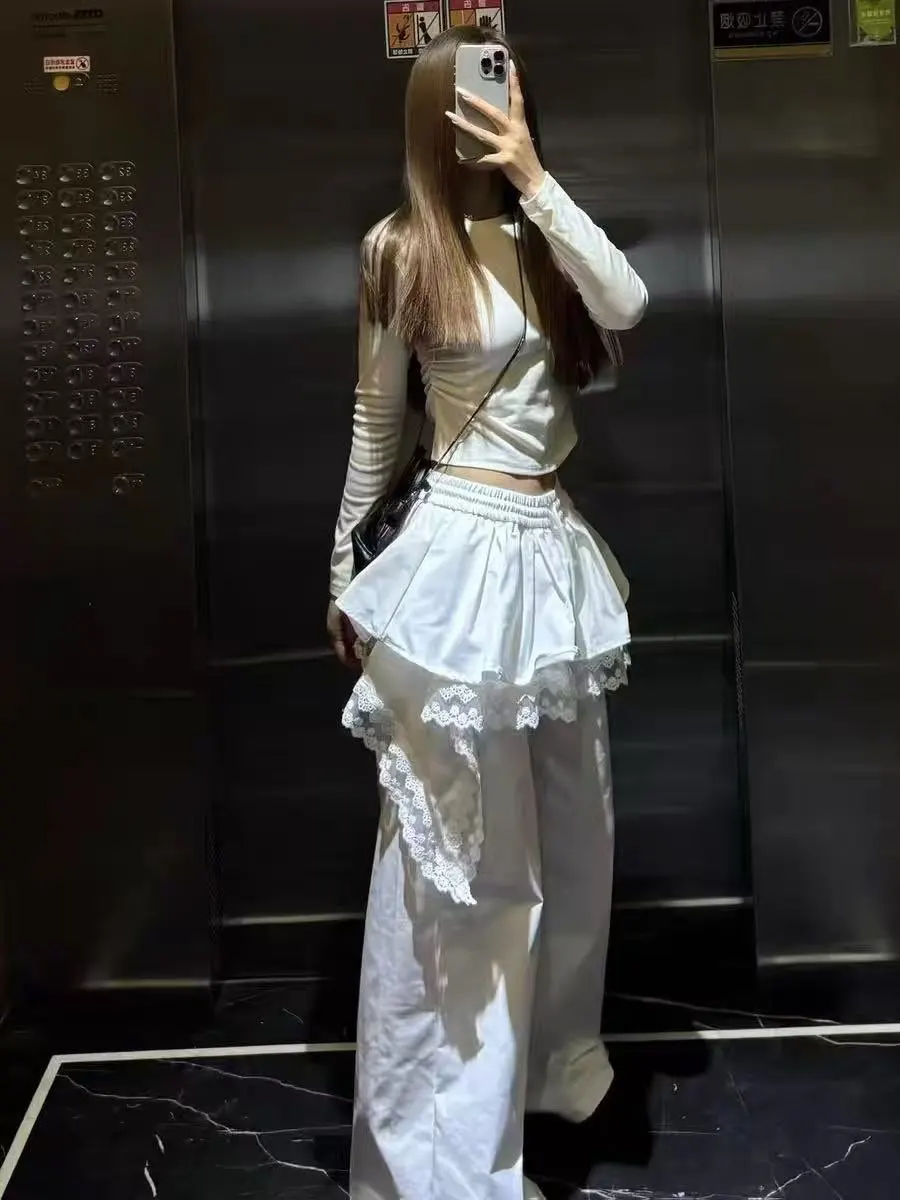 Step into the future of Y2K fashion with these absolutely revolutionary fake skirt cargo pants that perfectly capture early 2000s innovation! Featuring a dramatic detachable mini skirt overlay with delicate lace trim details paired with ultra-wide leg cargo pants underneath, this piece delivers that coveted cyberpunk meets kawaii aesthetic that defined the millennium era. The bold black colorway and oversized silhouette create an edgy statement look while the comfortable elastic waistband ensures all-day wearability for your futuristic adventures.