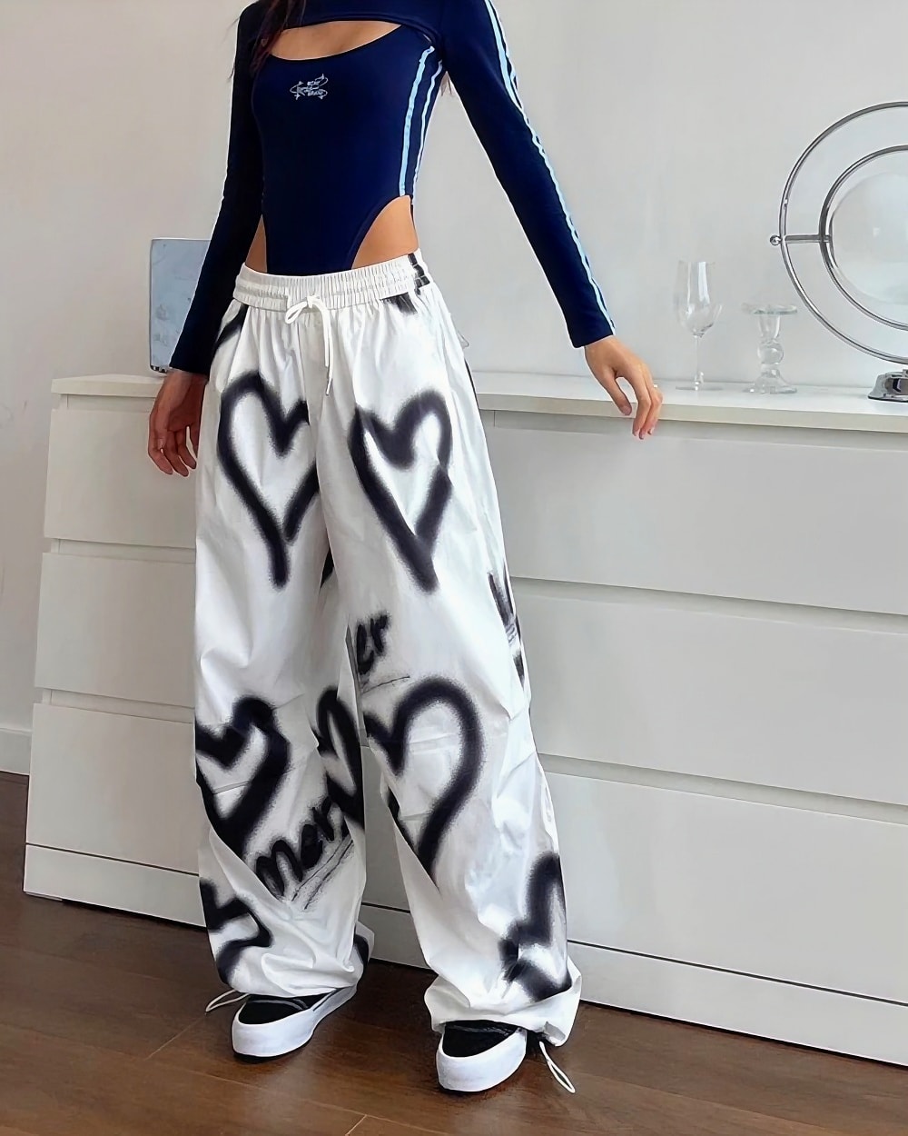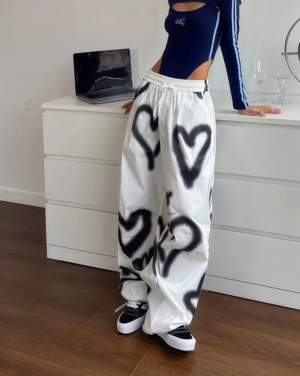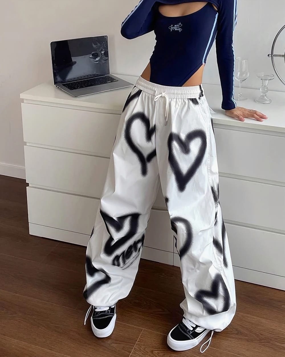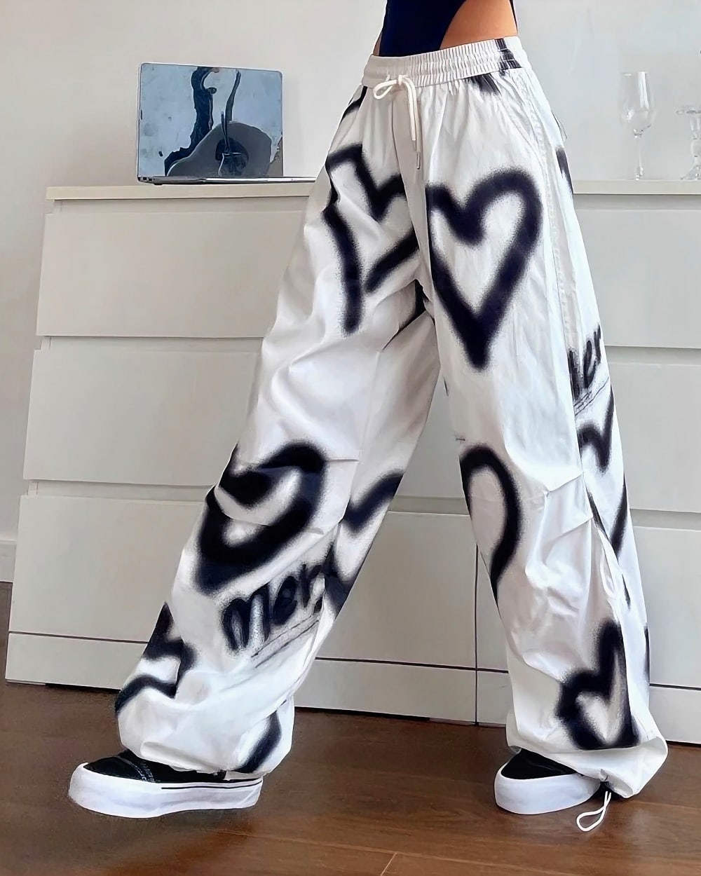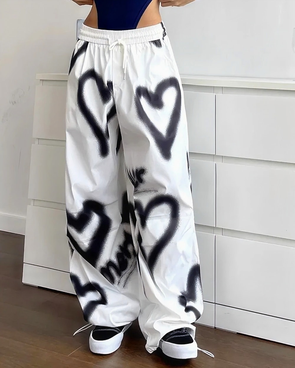 Transport yourself straight back to the early 2000s with these absolutely iconic high-waisted loose pants featuring the most dreamy black heart spray paint pattern! The relaxed baggy fit and ultra-comfortable elastic waistband create that perfect Y2K silhouette everyone’s obsessing over, while the artistic graffiti-style heart motifs add that authentic street art vibe that defined the era. Crafted from soft cotton blend fabric, these pants deliver maximum comfort without sacrificing that coveted vintage aesthetic.