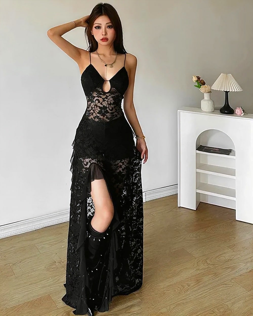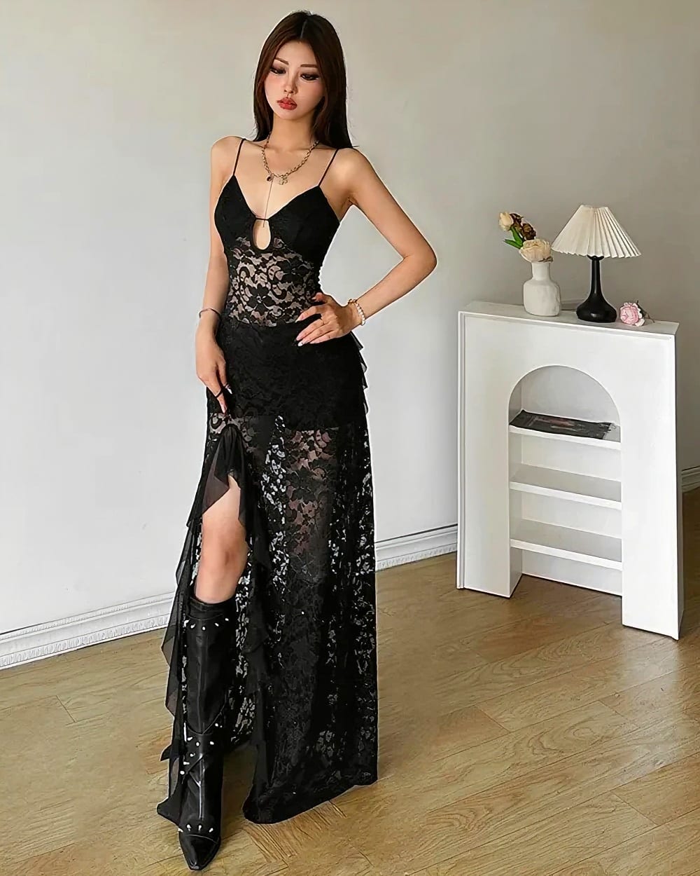 - Dramatic mid-calf length with strategic lace placement for movement and mystery