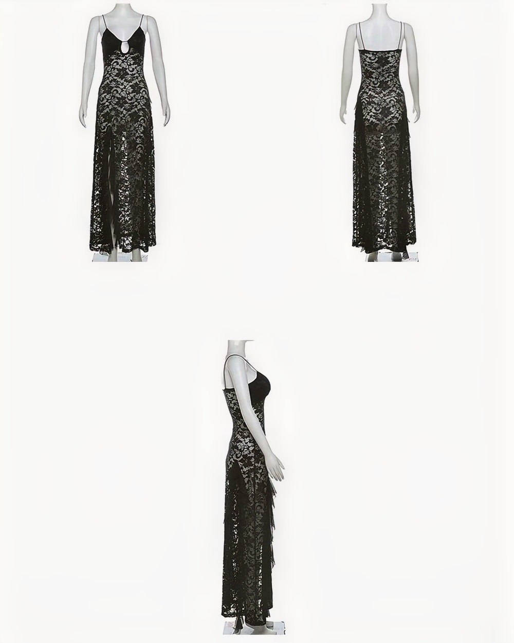 Embrace your dark romantic side with this enchanting black lace dress that perfectly blends gothic elegance with sultry sophistication. Crafted from high-quality polyester with intricate lace detailing, this mid-calf length masterpiece features delicate transparent panels that create an alluring yet tasteful silhouette. The empire waistline and A-line cut flatter every figure while the spaghetti straps add a touch of delicate femininity to balance the dramatic aesthetic.