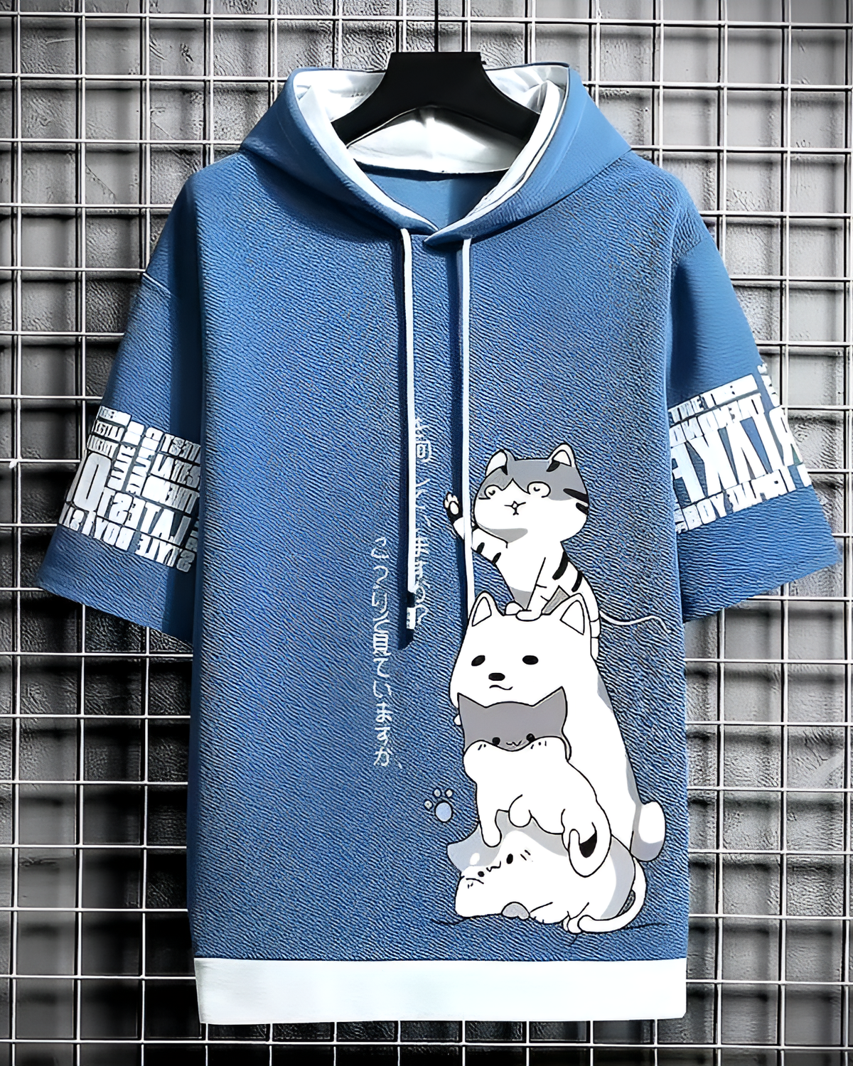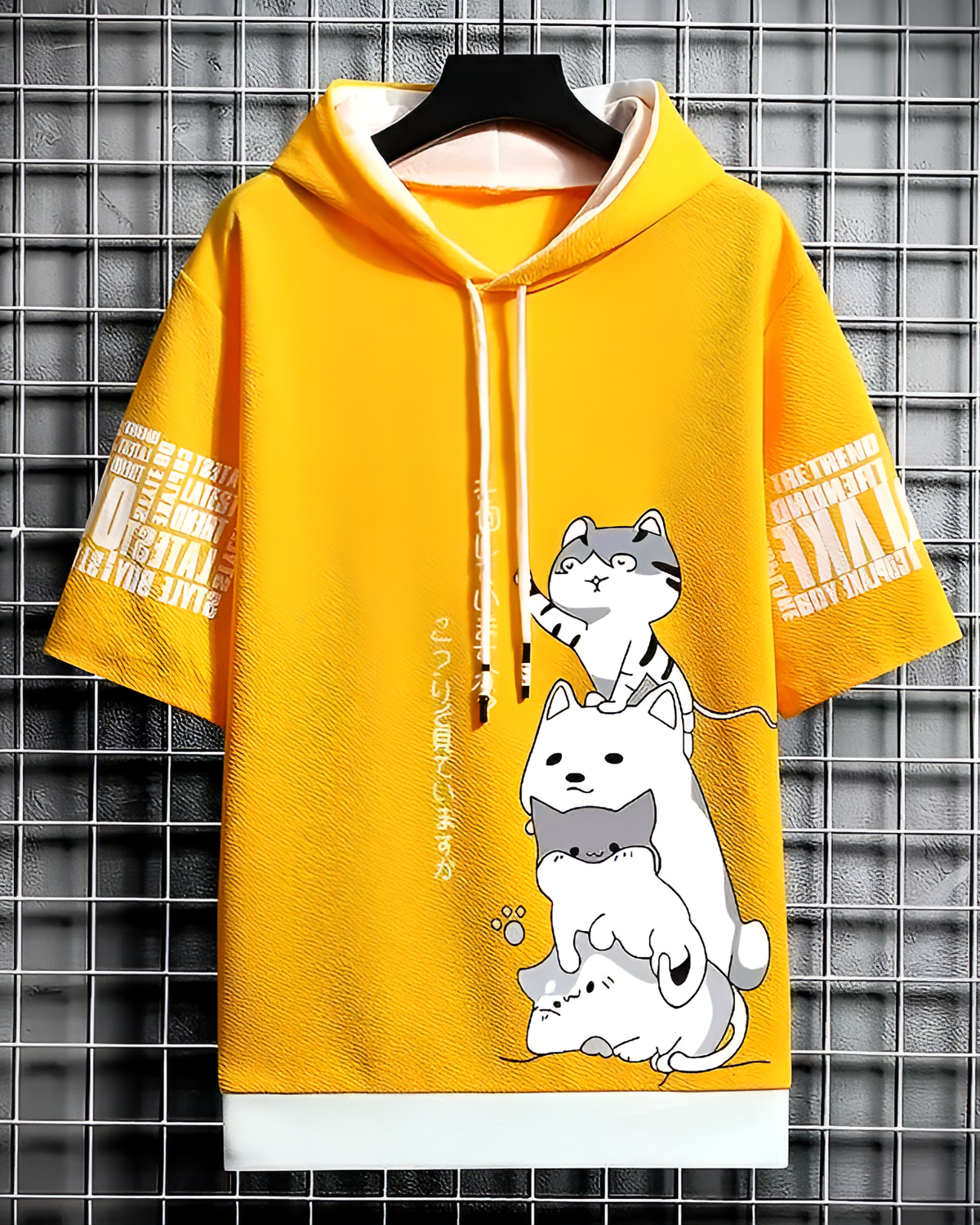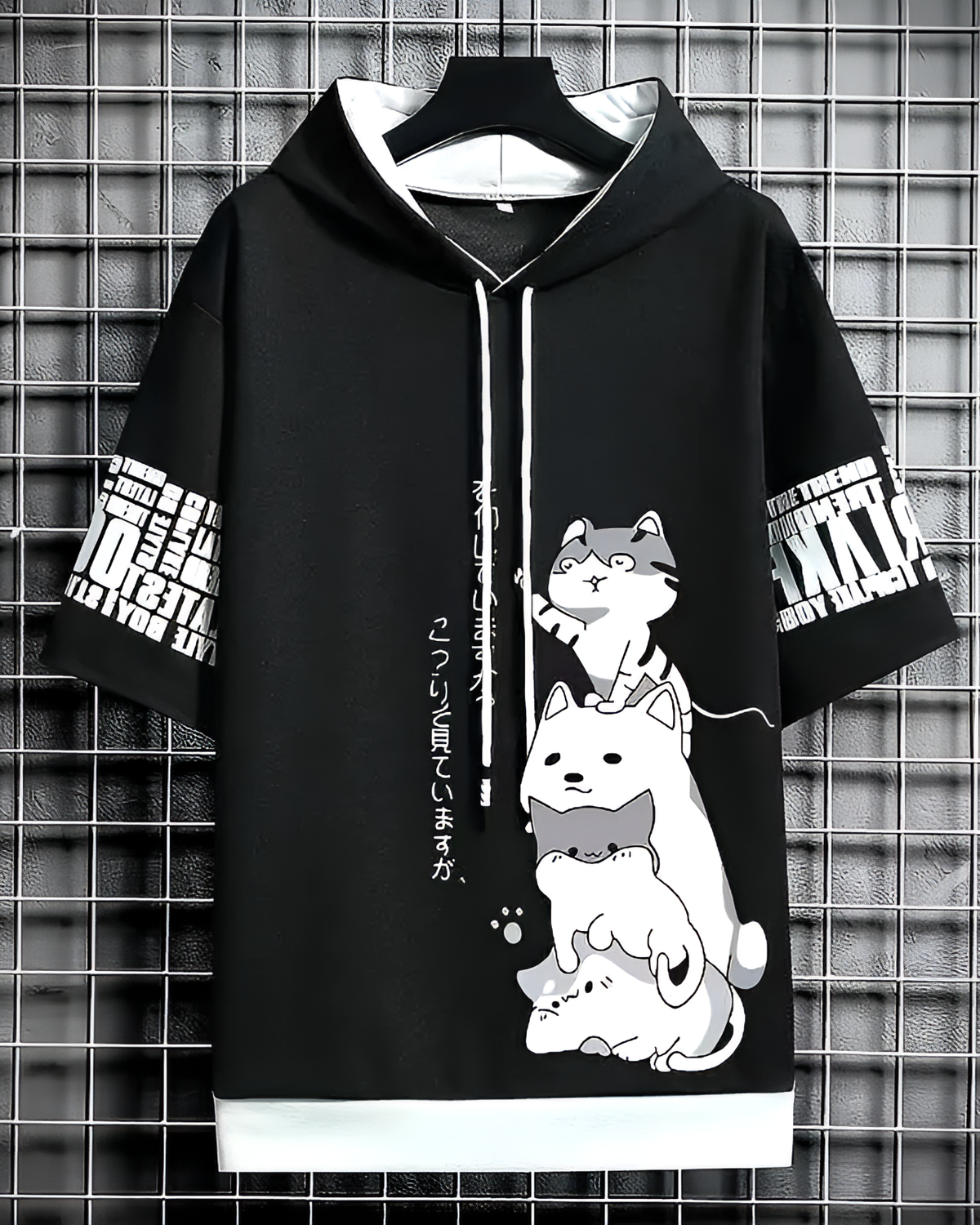 Featuring a whimsical foaming-print cat stack, this piece packs enough personality to distract from your messy room. The short sleeves and cozy hood keep the vibe strictly relaxed. (ᵔ◡ᵔ)