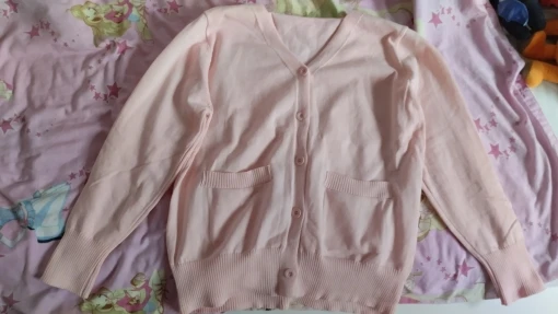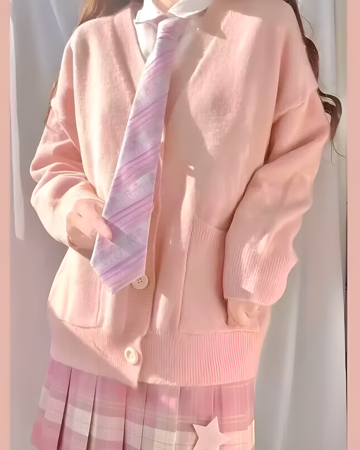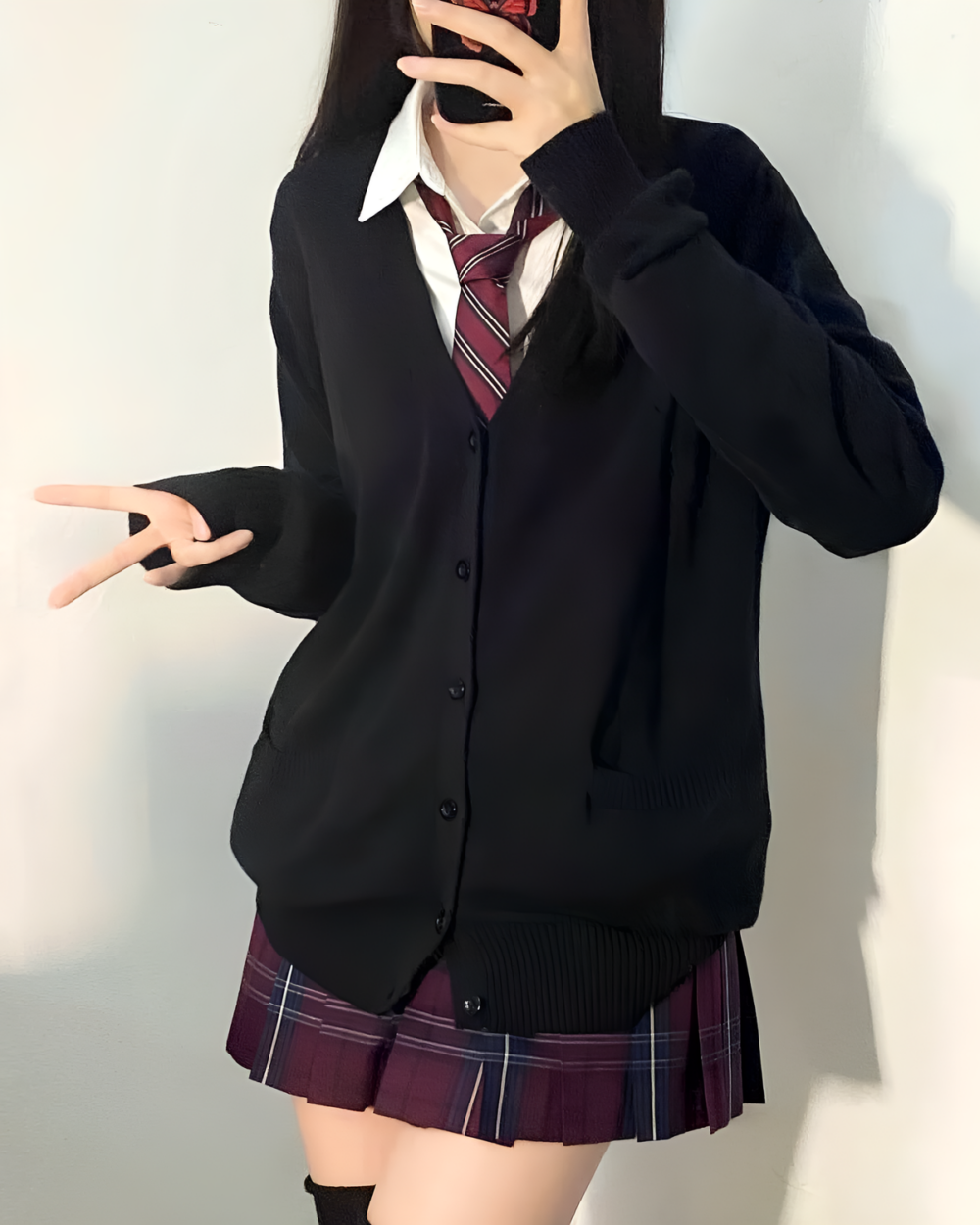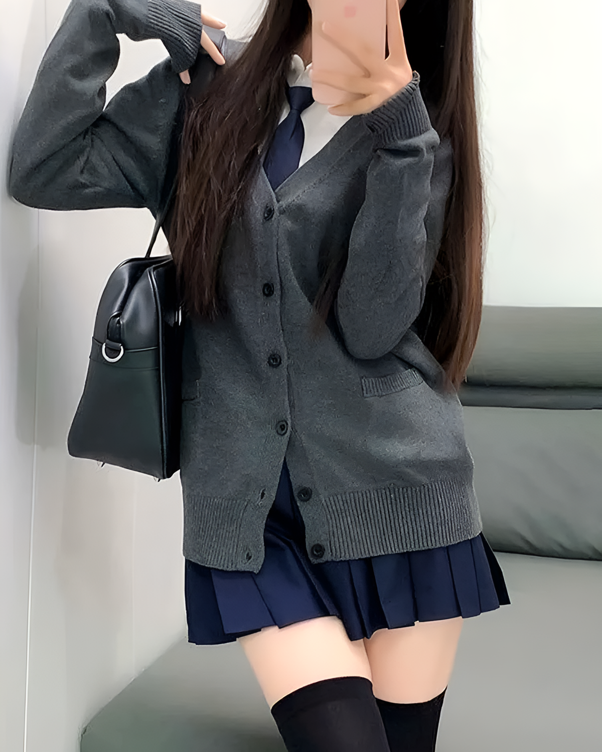 Featuring a simple V-neck button closure, this knit pairs perfectly with pleated skirts for that timeless academic look. Stay cozy while maintaining your signature style (✿◡‿◡).