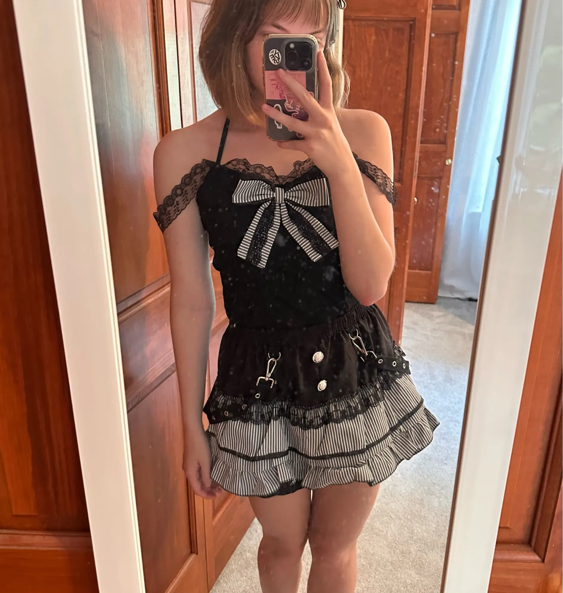 Bring a touch of dark sweetness to your wardrobe with this stunning coquette aesthetic ensemble. Crafted from a soft cotton and polyester blend, this set balances dreamy lace details with a sharp, structured silhouette for a perfectly polished look.