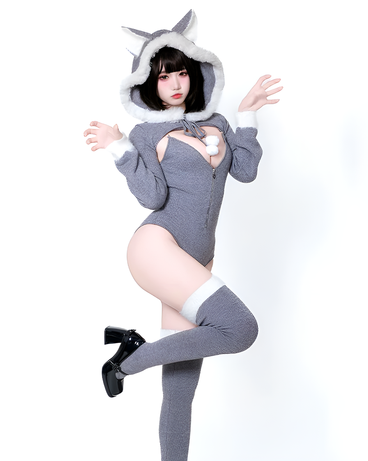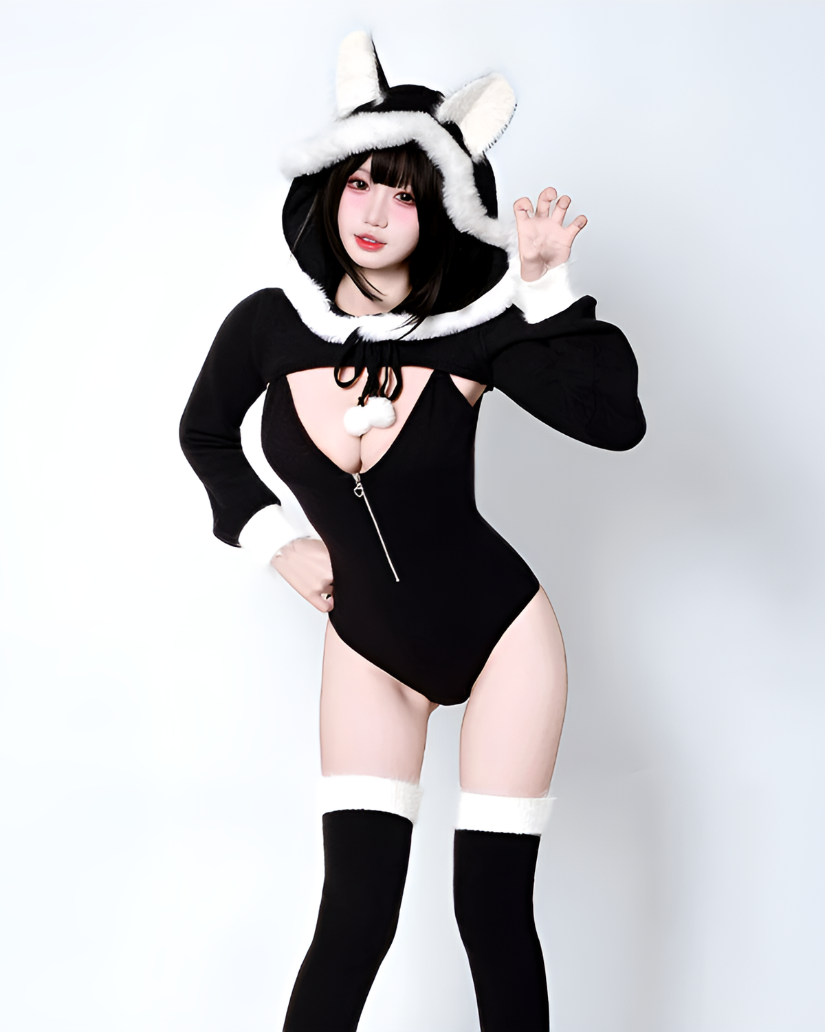 Each Kawaii Kitsune Bodysuit Set includes the plush-trimmed top, bodysuit, and matching over-the-knee socks. The pom-pom hoodie details give you that extra excuse to hide from direct eye contact. (๑>◡<๑)