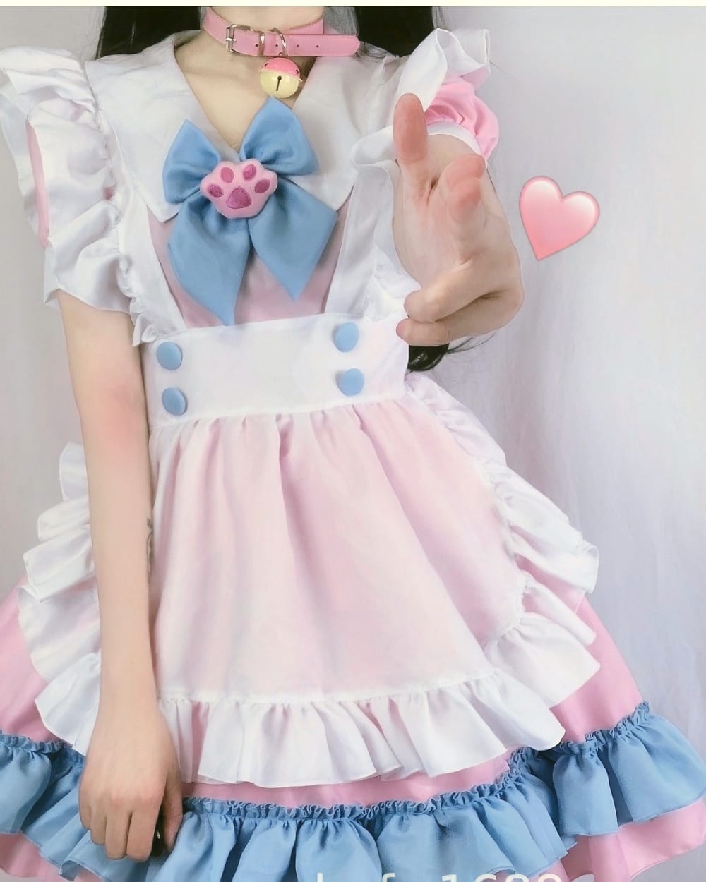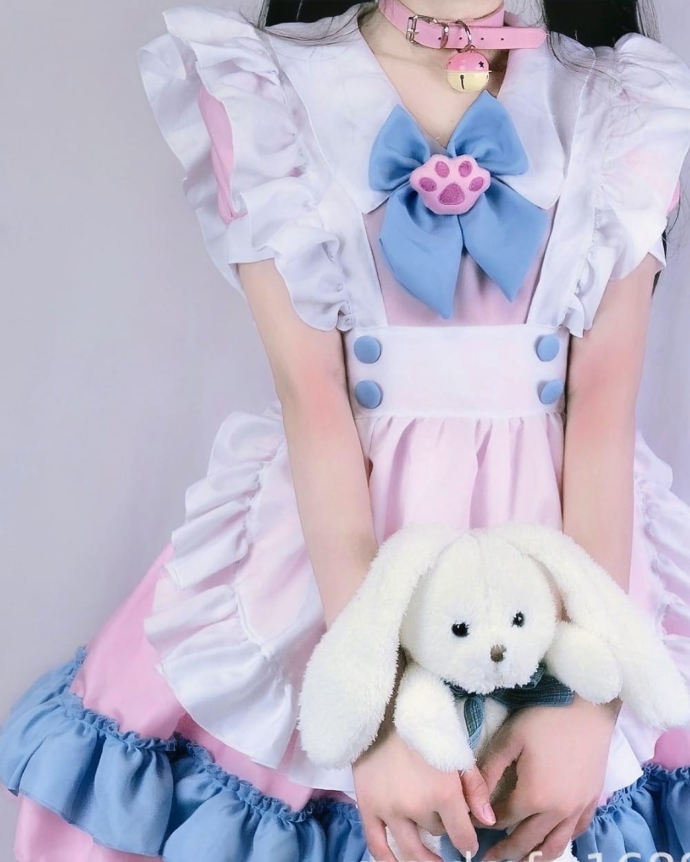 Includes: 1x E- pink blue Dress + 1x skirt support + 1x stockings + 1x Cat Collar