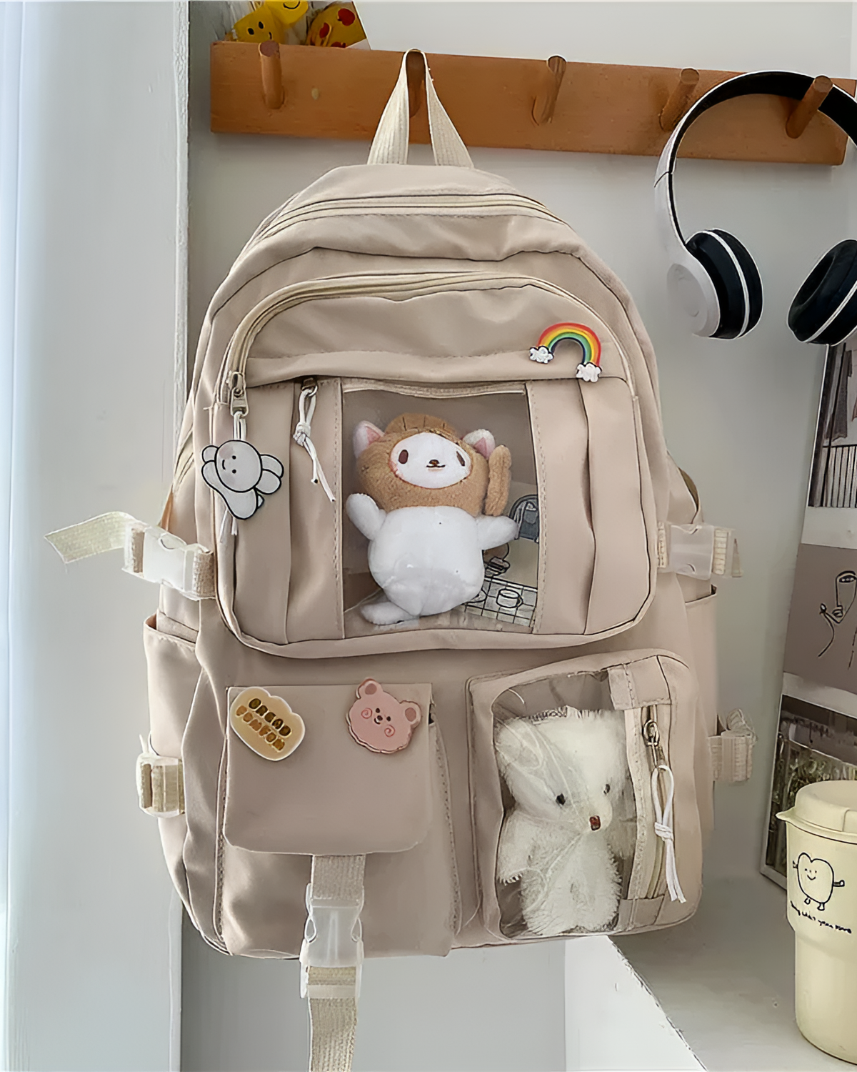 The Kawaii Vinyl Pockets Backpack features clear front windows for your most prized collectibles. Stuff them with plushies or pins and finally curate your aesthetic to perfection. (✿◠‿◠)