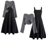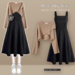 Color: gray sweater black dress two-piece set, light brown sweater black dress two-piece set