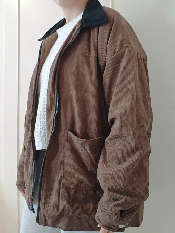 I ordered an xxl size to have an oversized look. My measurements (cm): 95 bust, 79 waist, 92 hip, 54 arms, 44 shoulders. It feels soft to the touch and there's an inner pocket. It's great for autumn and spring, or even for breezy summer days.