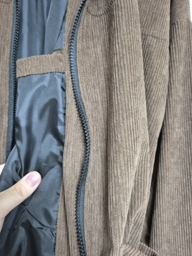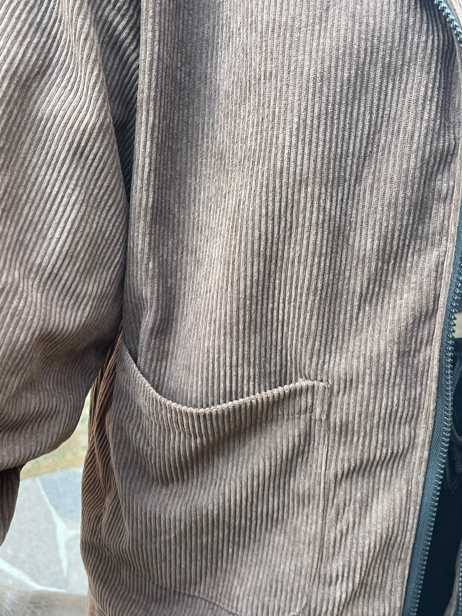 It’s a dark rich green in person. Very warm, while trying it on it already got warm inside. The corduroy is extremely soft as well. Found a secret pocket inside the coat. I’m 5’5” (165 cm) and 130 lbs (59 kg).