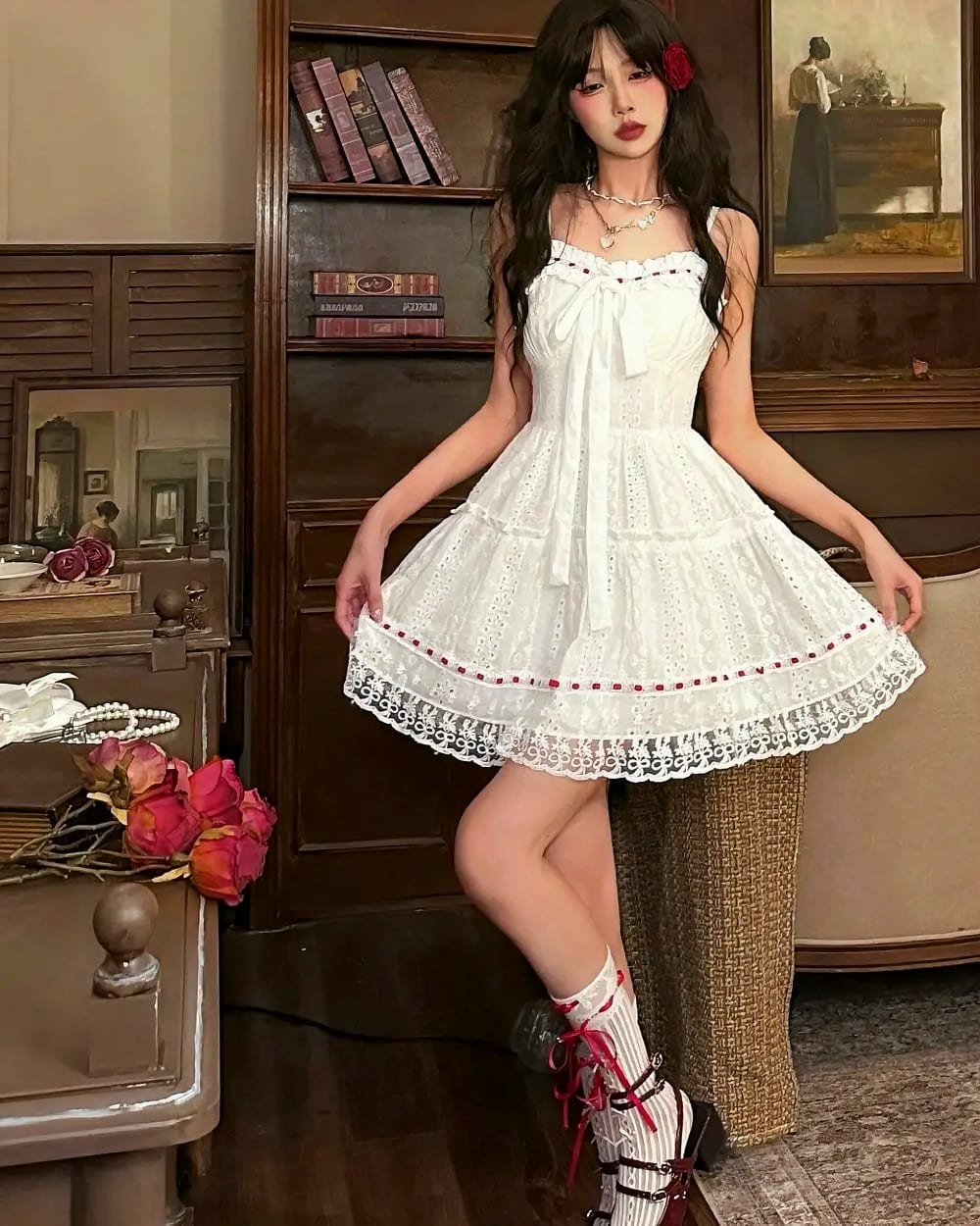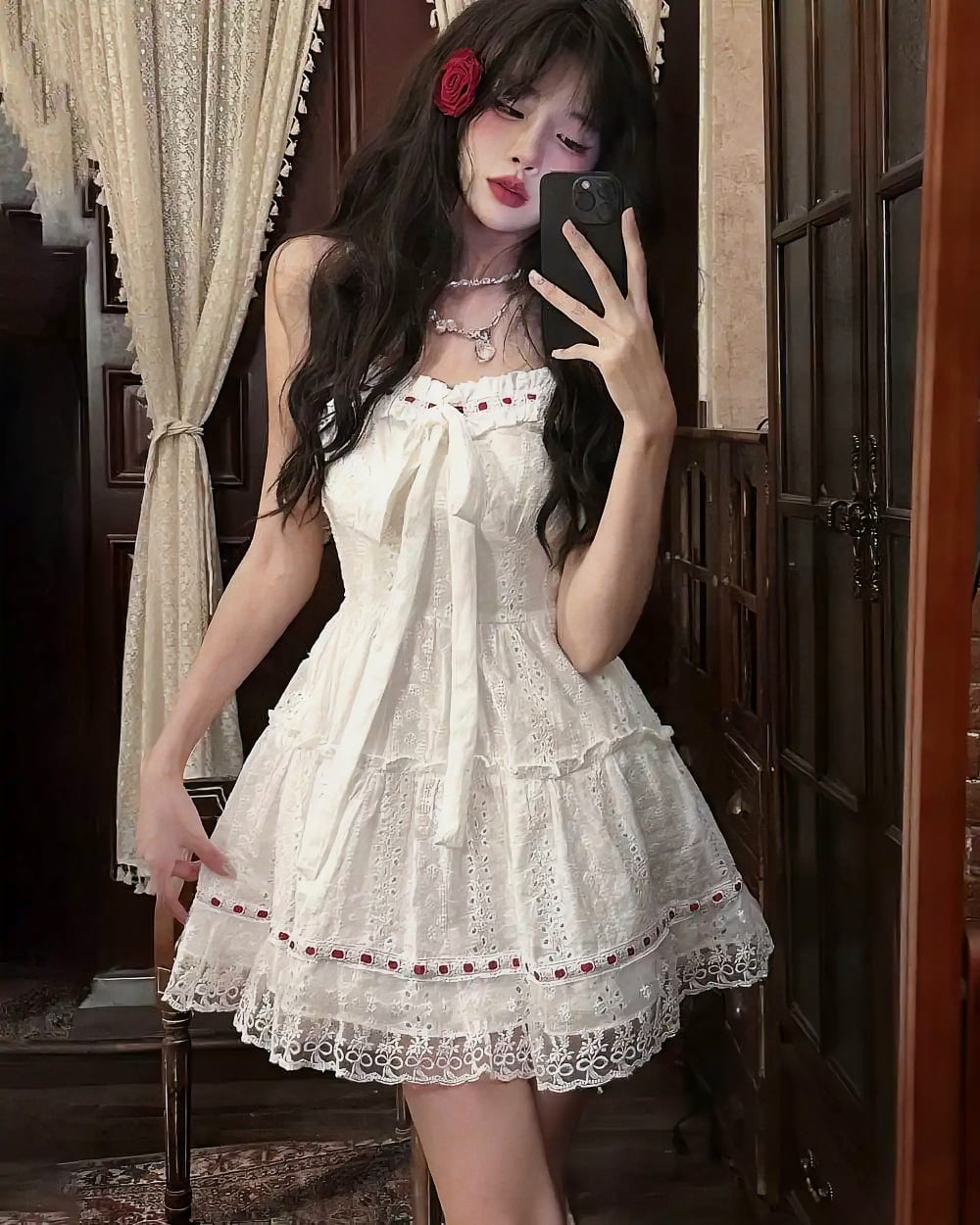 Step into a pastoral dream with this absolutely enchanting white eyelet lace dress that perfectly captures cottagecore elegance with lolita charm! Featuring intricate eyelet embroidery throughout with delicate red cherry embellishments along the neckline and hem, this piece delivers that coveted vintage countryside aesthetic. The romantic tiered skirt design with multiple layers of lace trim creates beautiful movement while the off-shoulder neckline with gathered ruffle detail adds that perfect touch of innocent femininity every cottagecore princess adores.