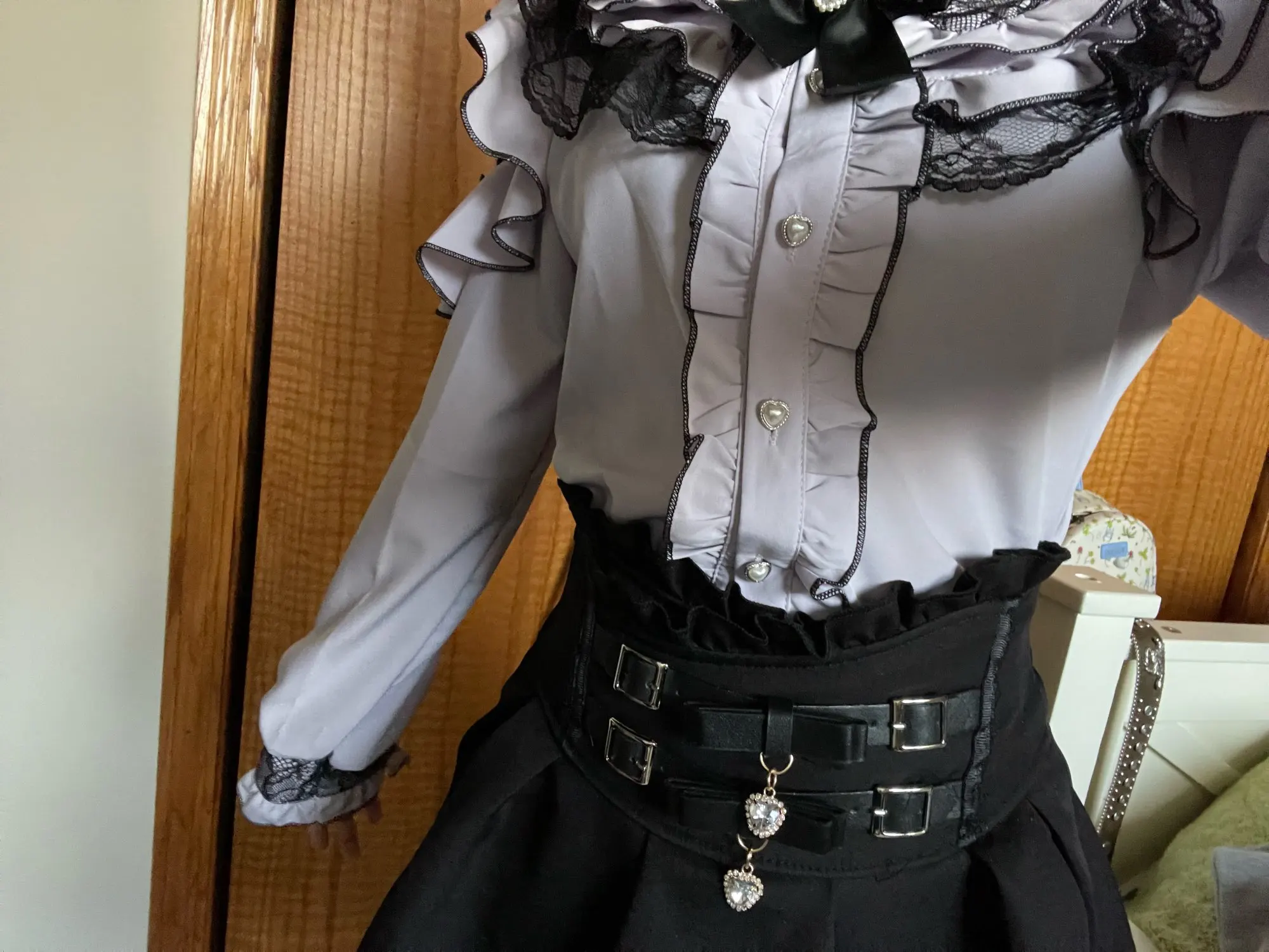 ✿ Delicate lace inserts on the shoulders and cuffs for a soft, gothic-inspired touch.