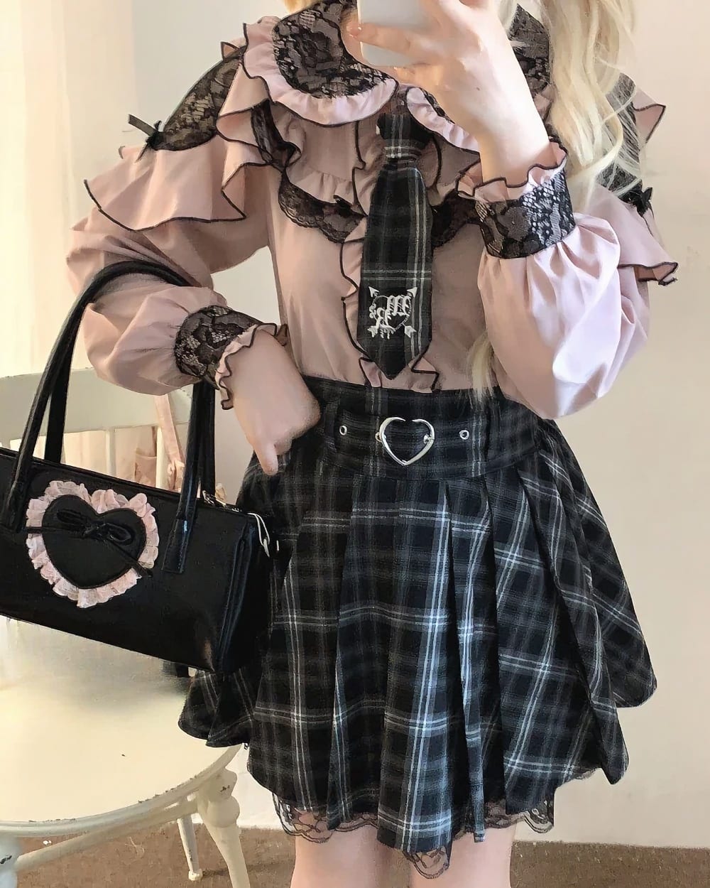 ✿ Pair with a high-waisted plaid pleated skirt and lace-topped stockings for the ultimate Jirai Kei look.
