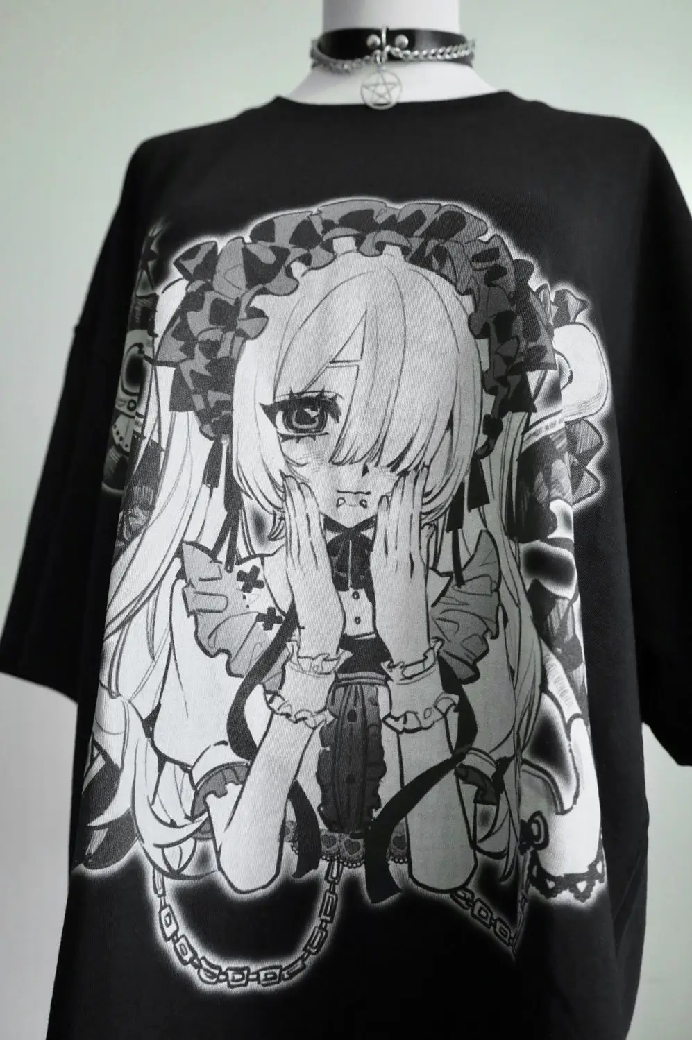 - ✿ High-contrast manga-style print featuring bold linework and gothic-inspired details.