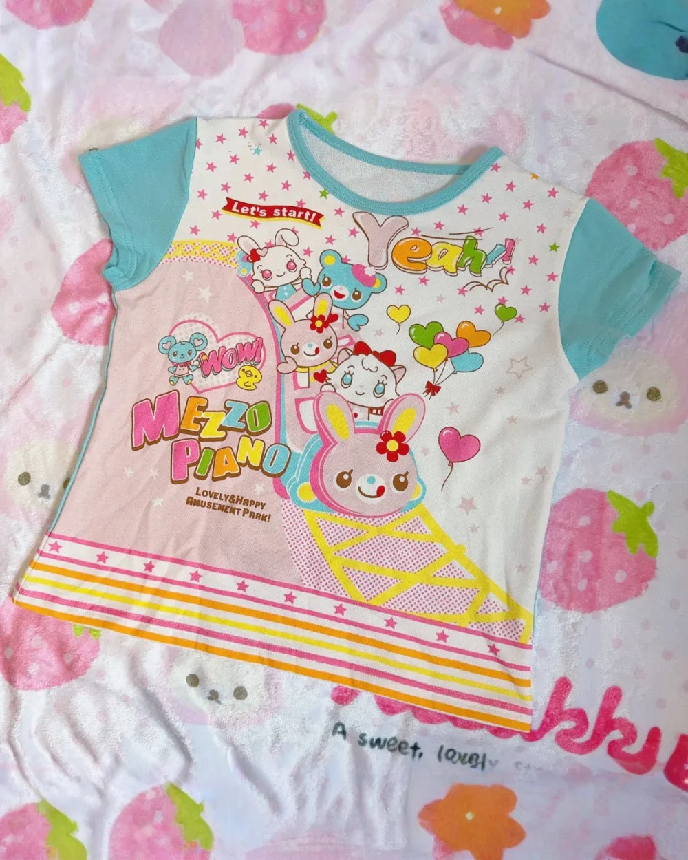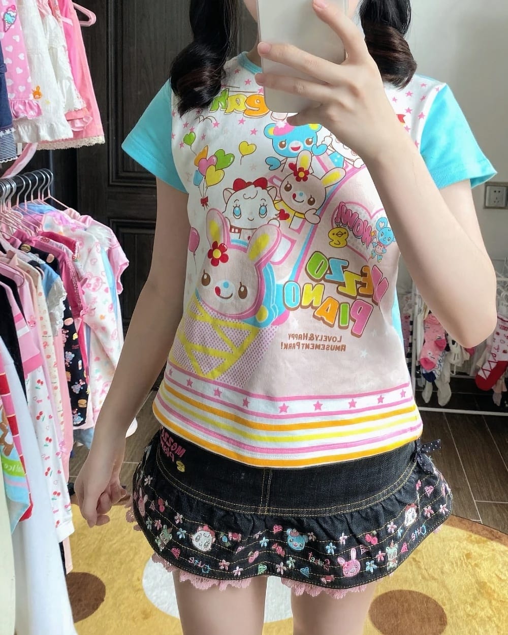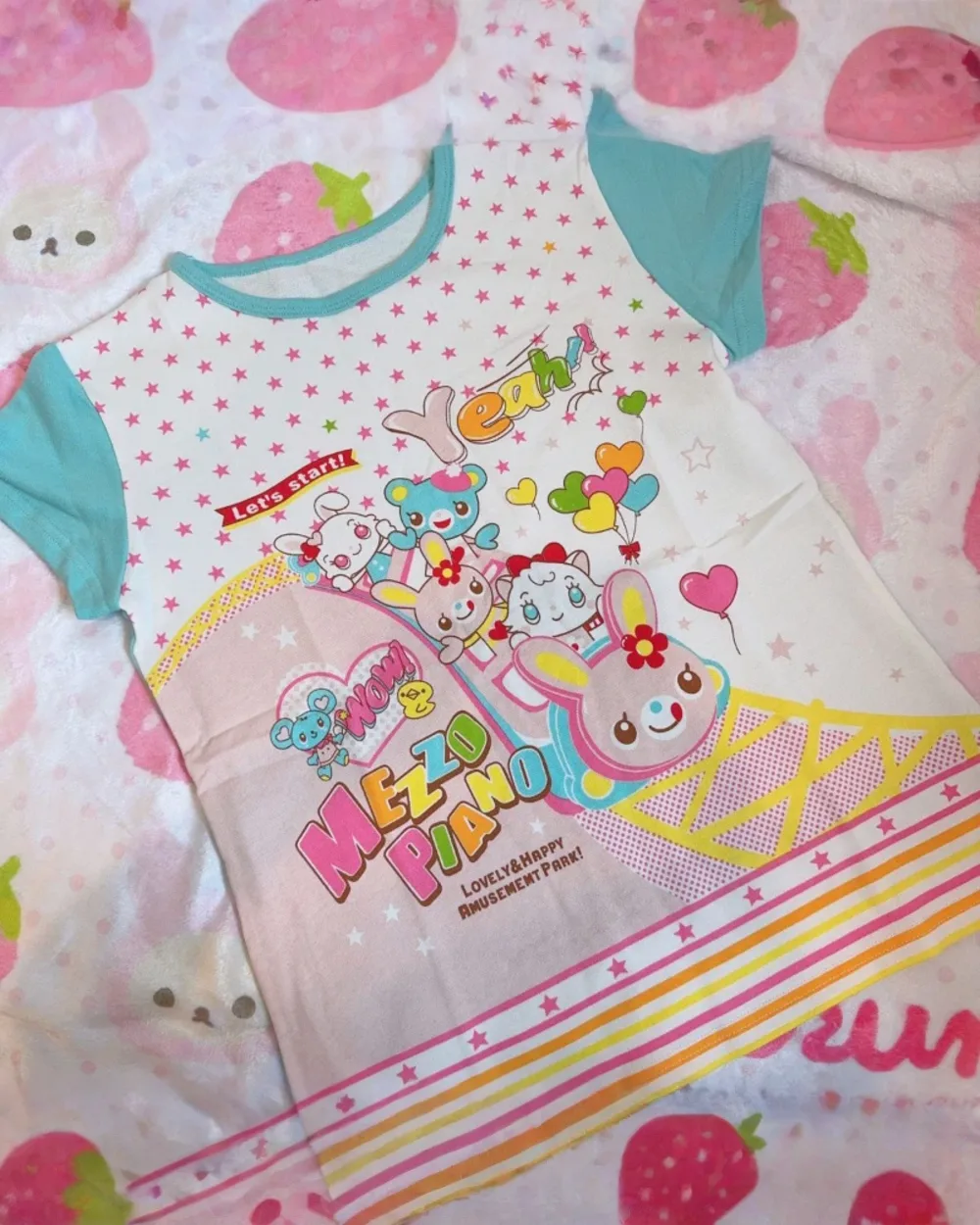 Channel your inner arcade princess with this vibrant Mezzo Piano inspired top. Featuring a dreamy collage of retro mascots and colorful ice cream graphics, this piece captures the nostalgic charm of 2000s Japanese street fashion in a comfortable, modern cut.
