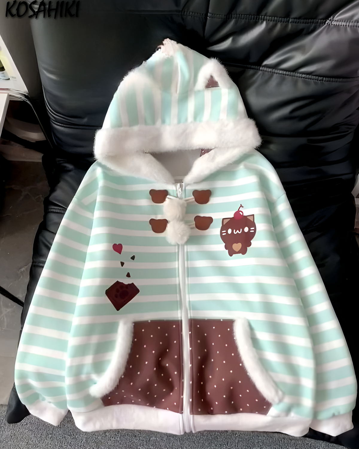 Bring a splash of sweetness to your daily rotation with this adorable mint striped zip-up. Crafted from a soft cotton blend with a loose fit, this hoodie features plush furry trim and playful pom-poms that capture the essence of Japanese street fashion.
