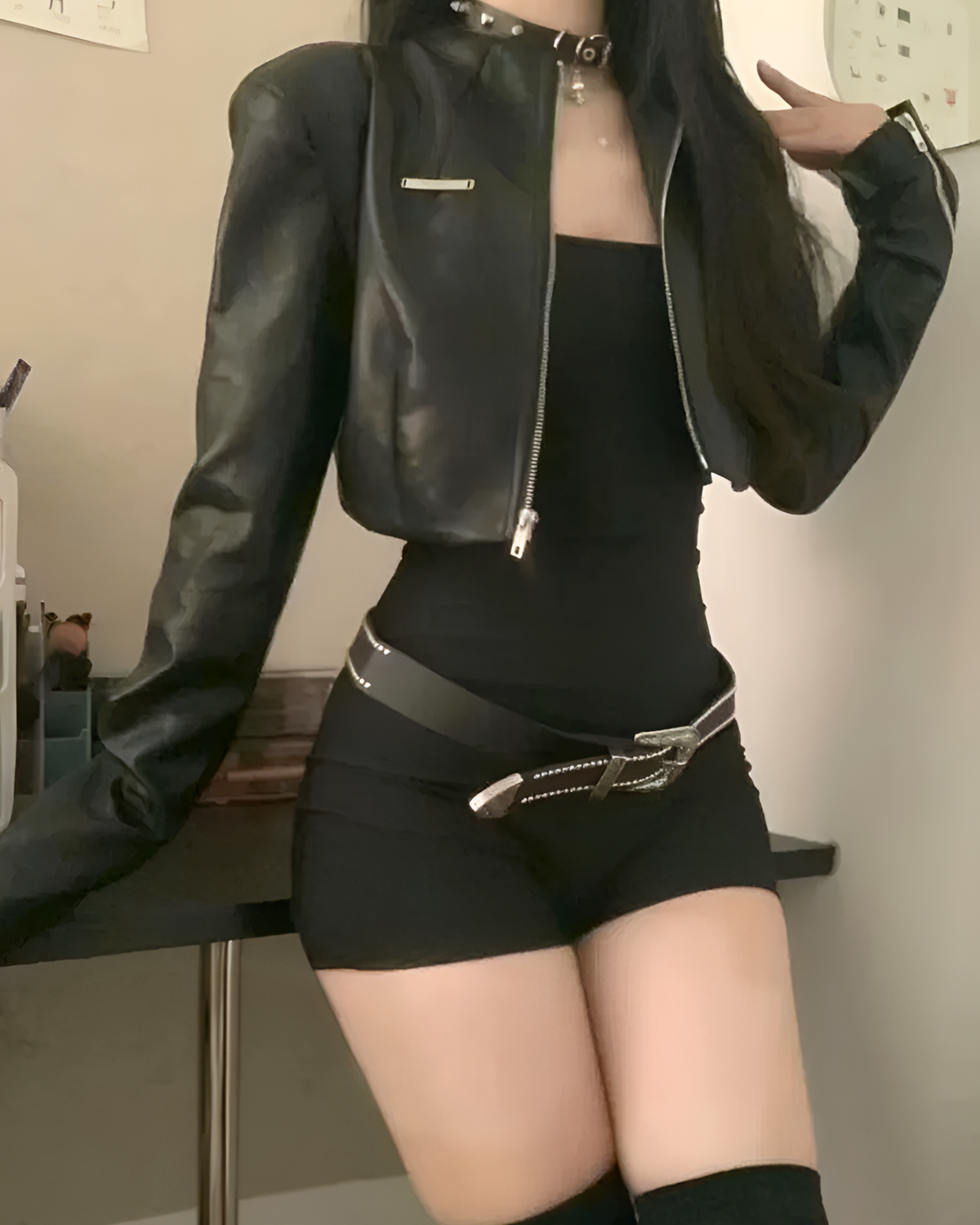 The Noir Shadow Crop Moto Jacket features a blended synthetic knit for a sleek, structured silhouette. It feels substantial without weighing you down during your main character moments.