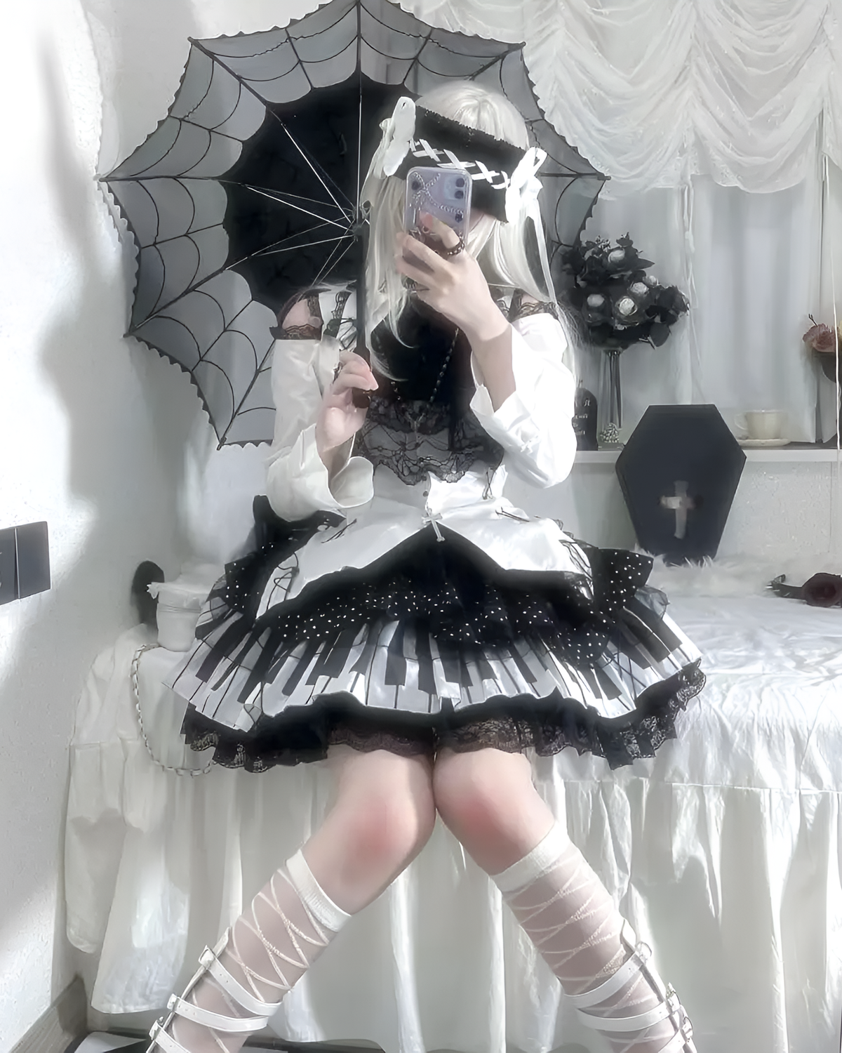 The mini A-line silhouette features quirky black and white piano key patchwork. Lace trim adds that extra gothic drama your outfit has been missing lately. (・∀・)