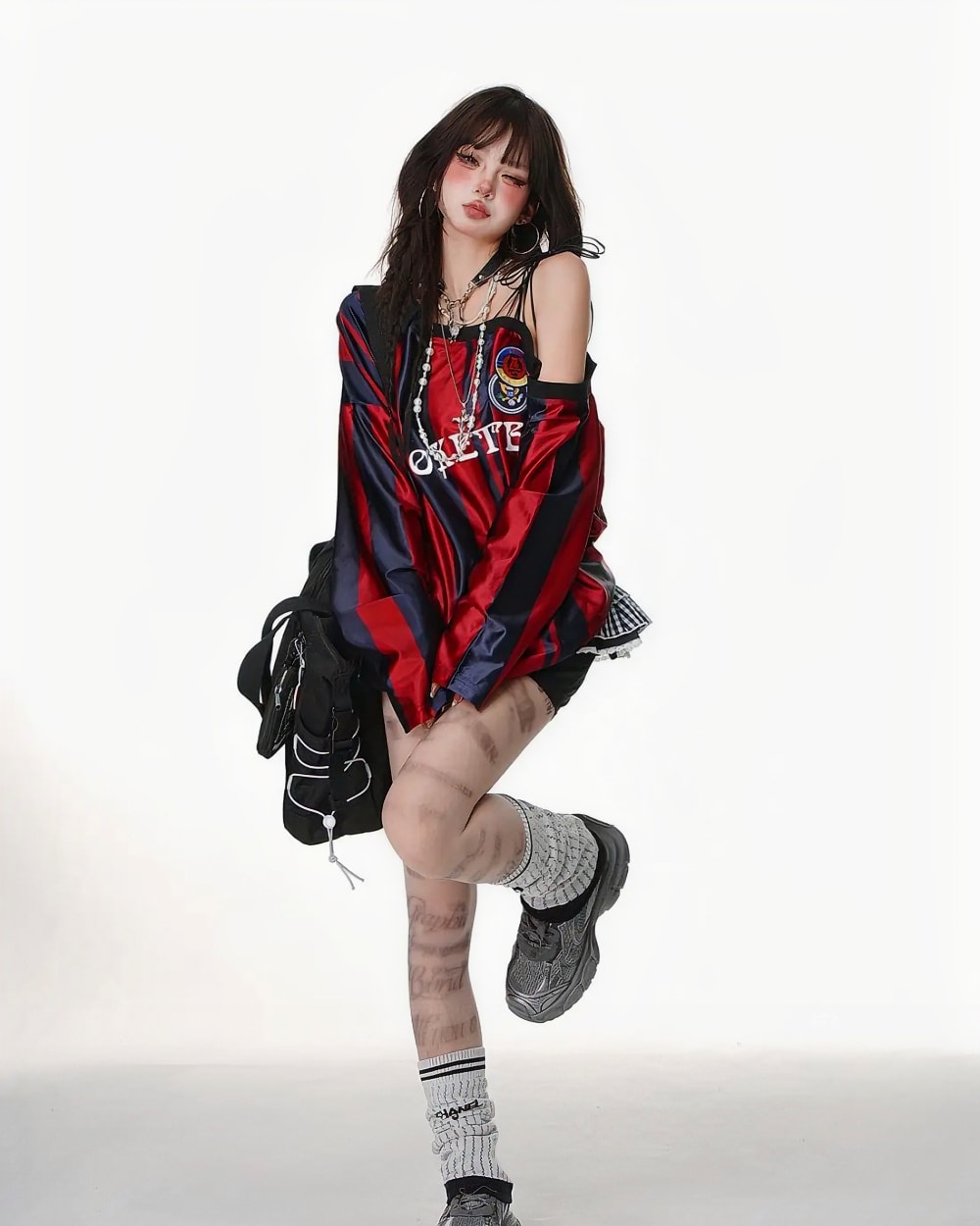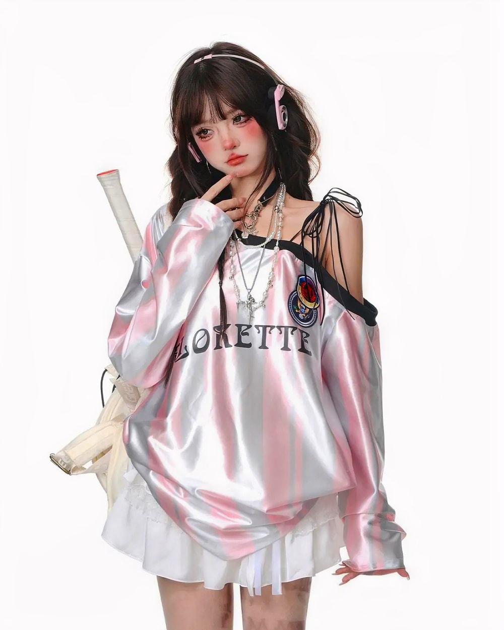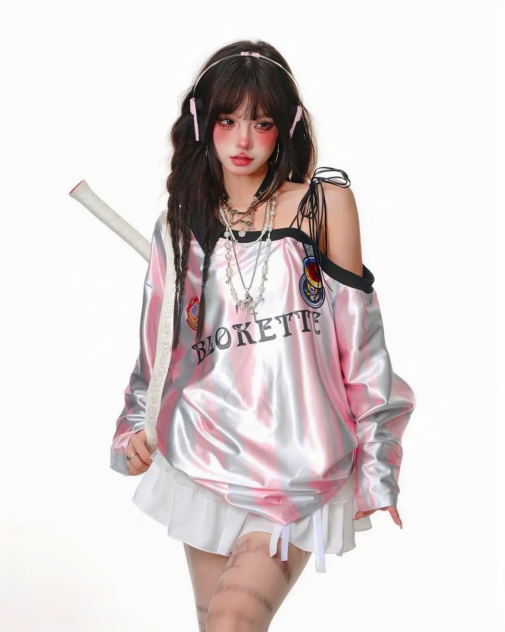 Transform your everyday look into pure coquette magic with this dreamy iridescent sweatshirt! Crafted from soft, shimmery fabric that shifts between pink and silver, this off-shoulder beauty features adjustable black ribbon ties and adorable patch details that scream kawaii perfection. The relaxed fit ensures all-day comfort while maintaining that effortlessly cute vibe. ✨