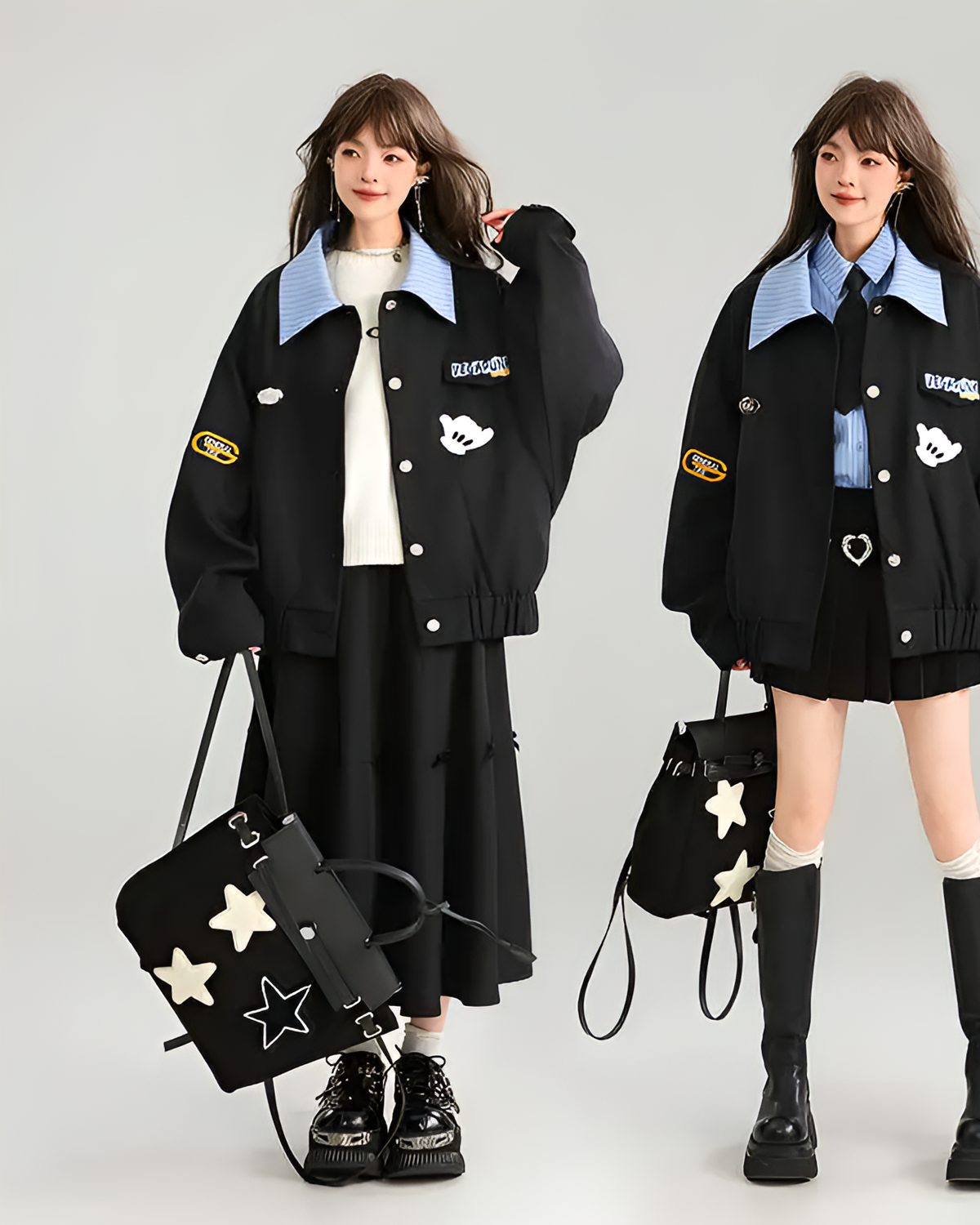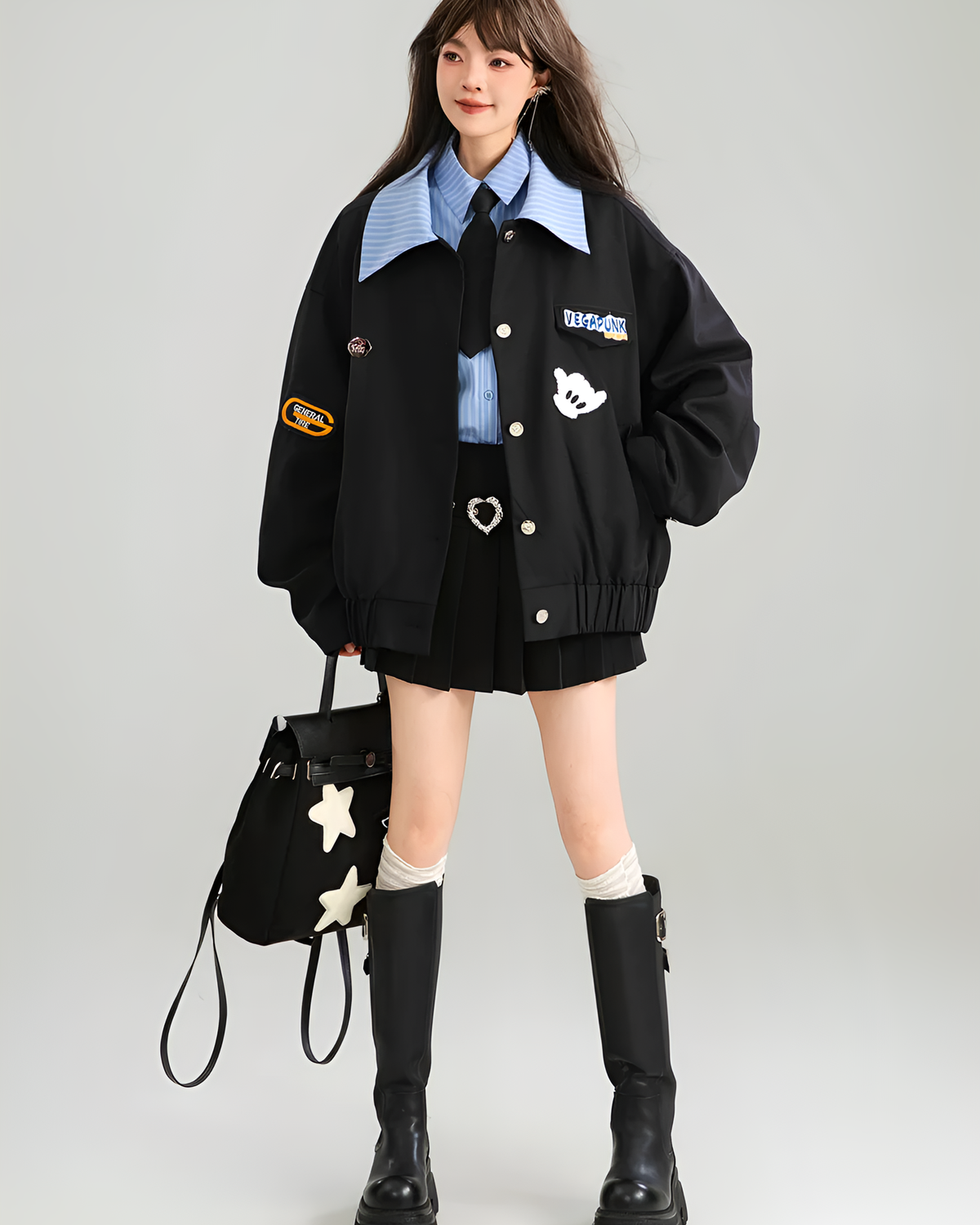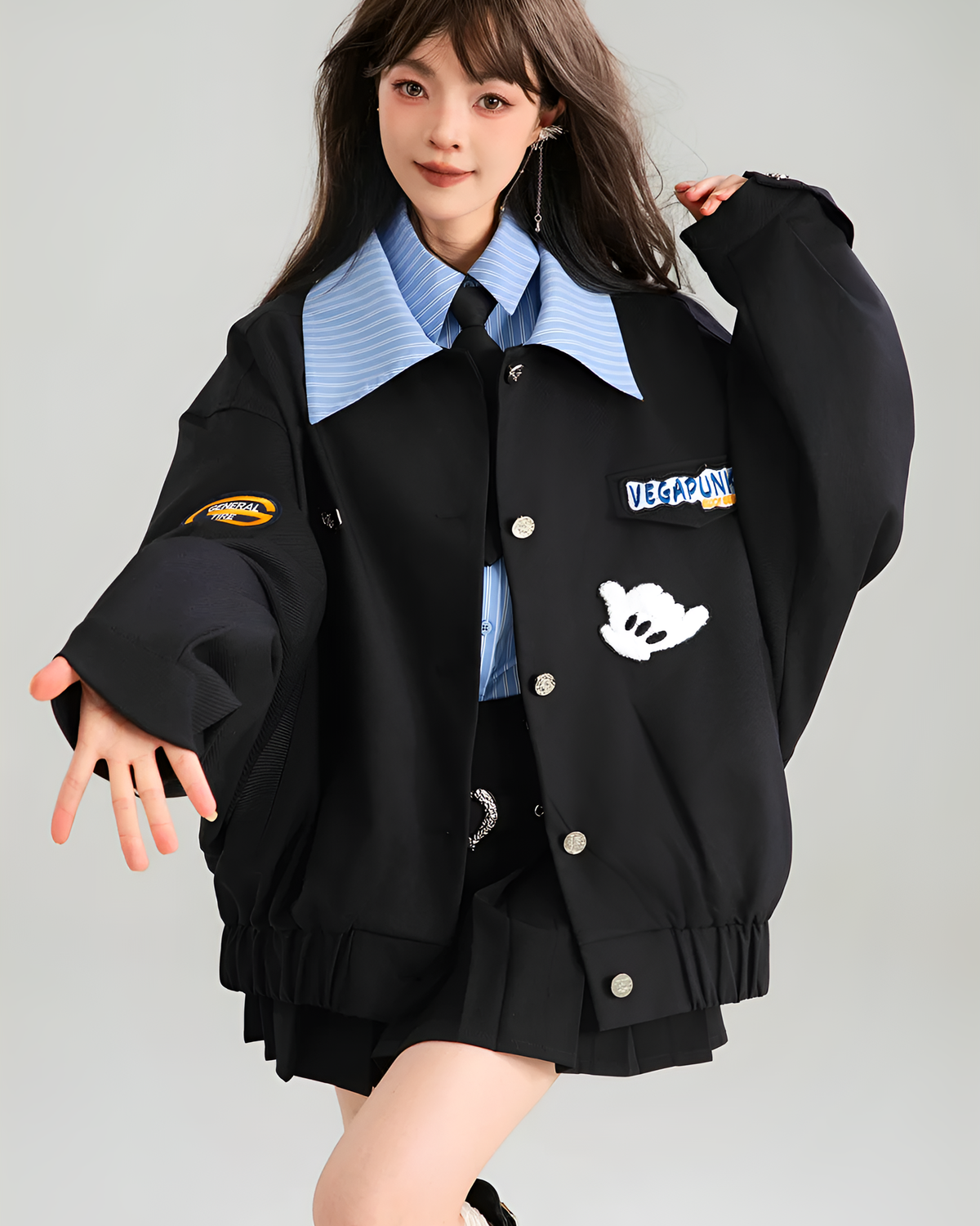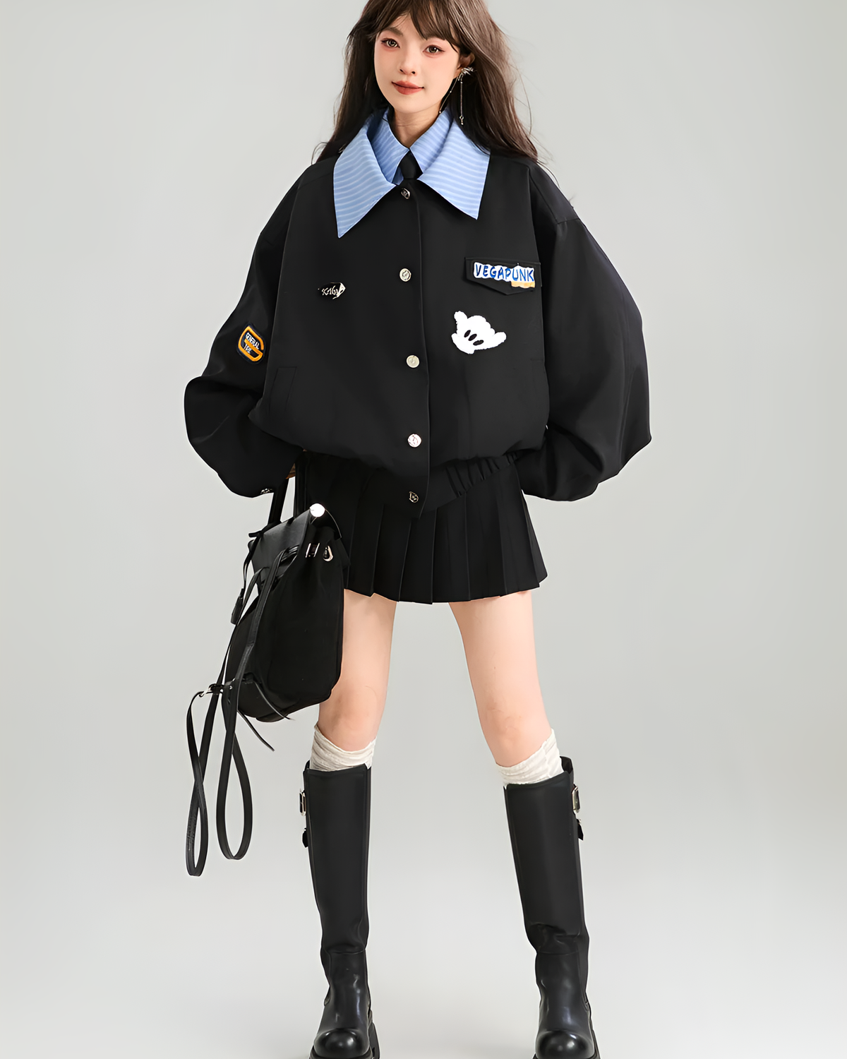 The turn-down collar and cheeky hand patches make this loose-fit piece stand out from your basic monochrome closet. Wear it buttoned or open, just don’t expect it to fix your schedule. (✿◕‿◕✿)