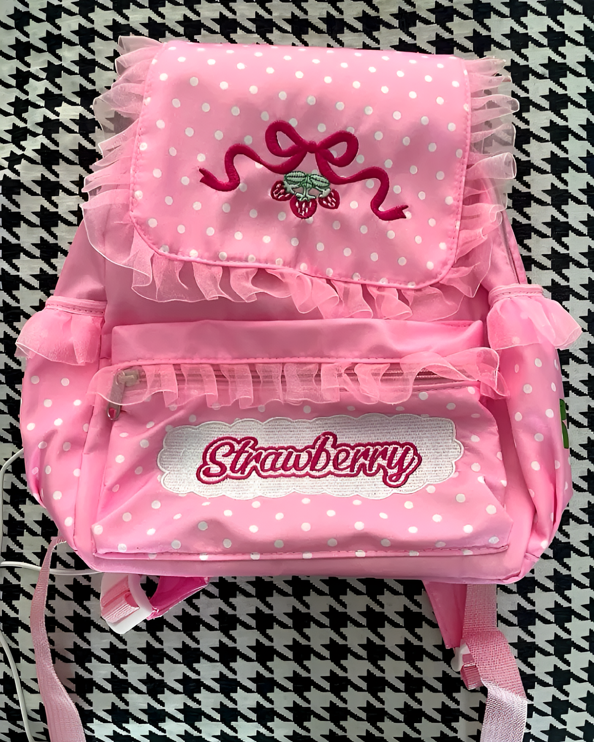 Featuring ruffles, polkadot patterns, and delicate strawberry embroidery, it handles your gear with maximum flair. This bag is proof that you can be unbothered, cute, and prepared for anything. ( ˶ˆᗜˆ˵ )