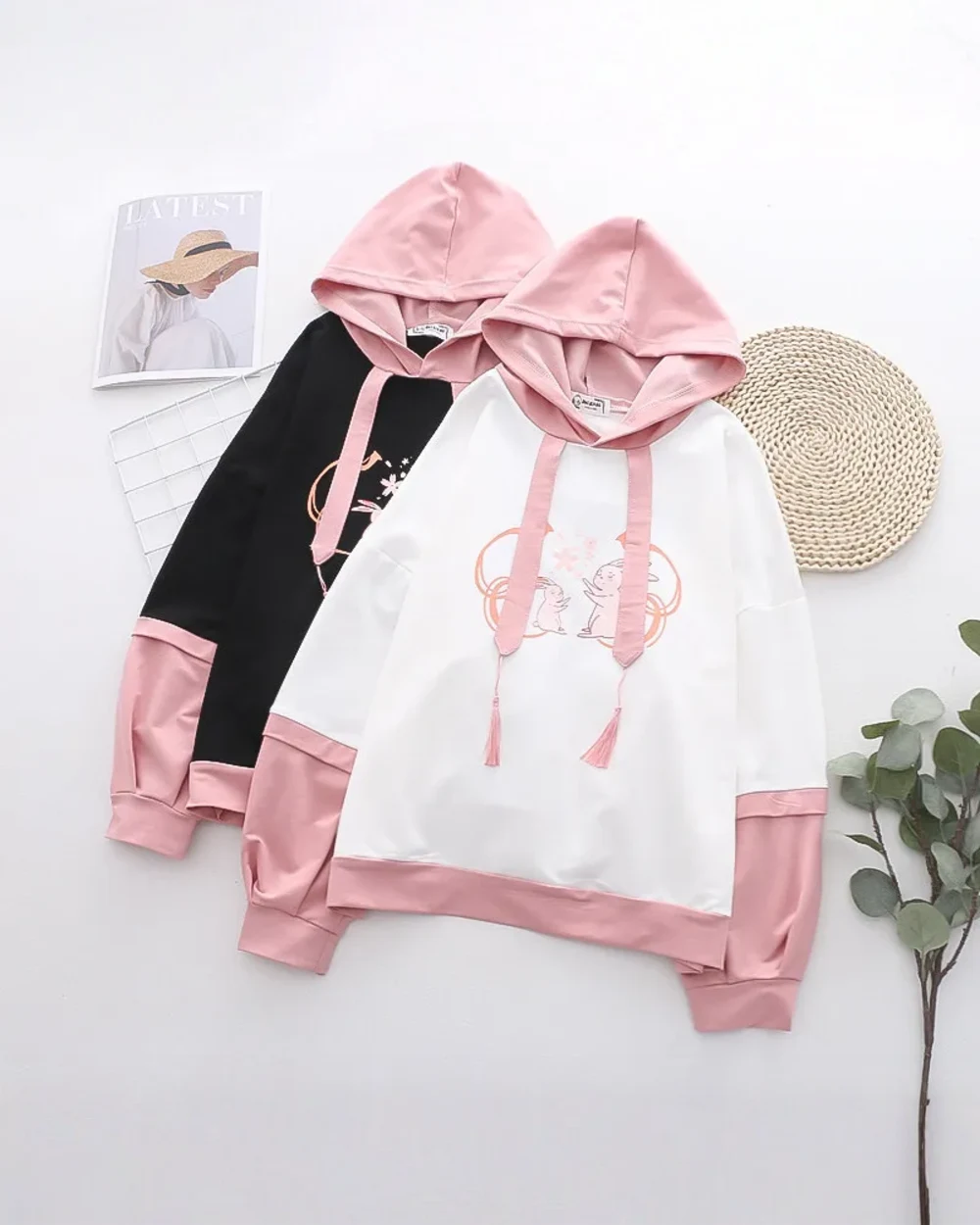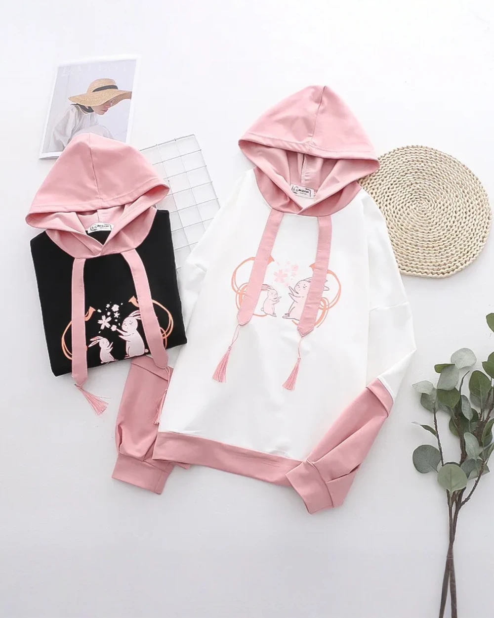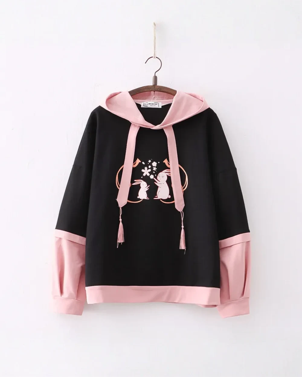 Embrace kawaii perfection with this absolutely enchanting hoodie featuring the sweetest sakura bunnies in a dreamy pink and white colorway! Available in both classic white and edgy black, each hoodie showcases adorable bunny characters surrounded by delicate cherry blossoms with gold metallic accents that catch the light beautifully. The color-blocked design with soft pink sleeves and hood creates that perfect harajuku street style silhouette while the charming tassel drawstrings add that extra touch of playful Japanese fashion flair.
