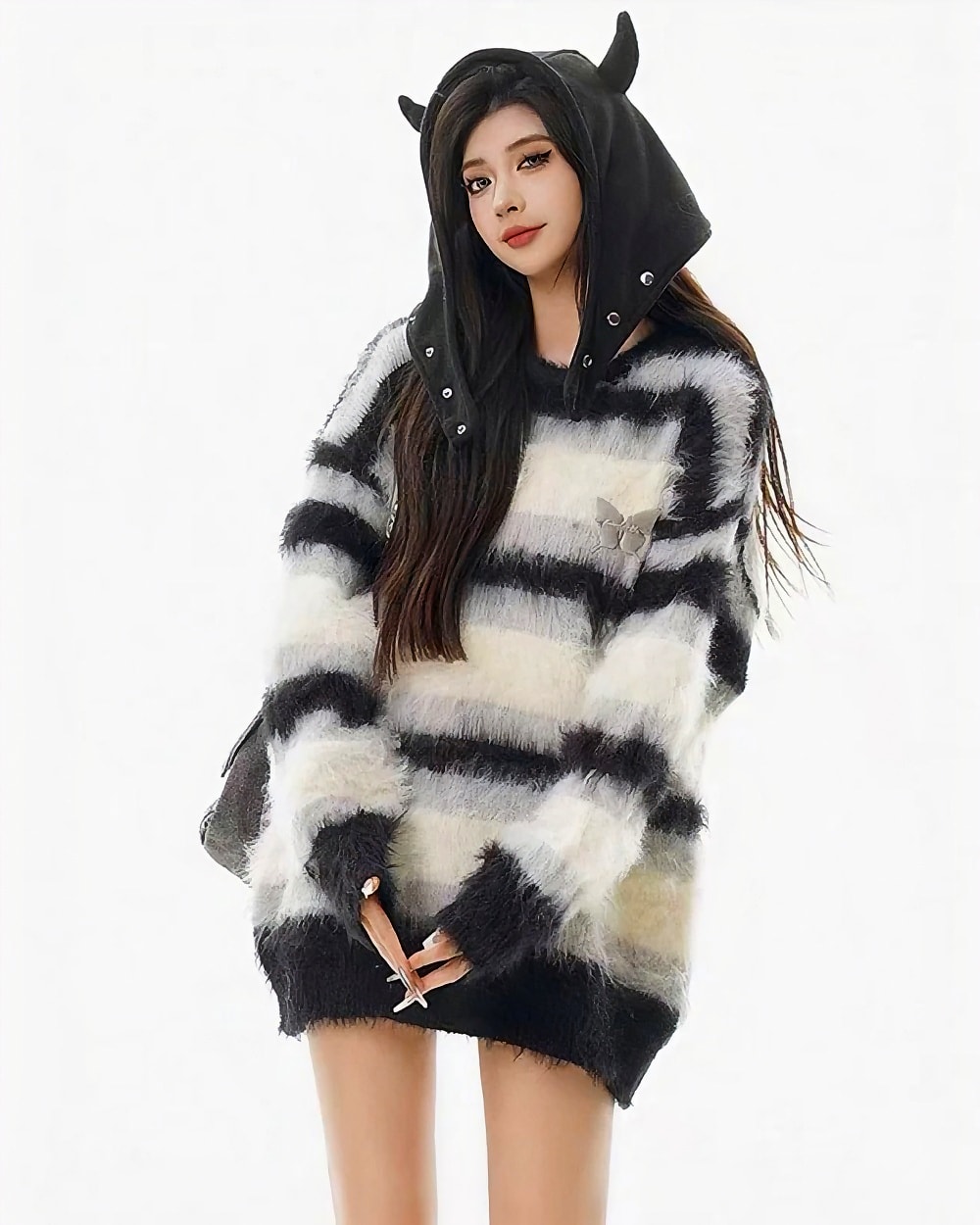 Channel that dreamy Korean street style with this absolutely enchanting oversized fuzzy sweater! The luxurious black and cream striped pattern creates the perfect monochrome magic while the ultra-soft fluffy texture feels like wrapping yourself in the coziest cloud. Complete with an adorable hooded design featuring the sweetest little horns, this piece captures that playful yet sophisticated K-fashion vibe that’s taking the world by storm.