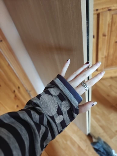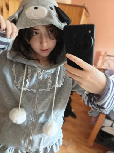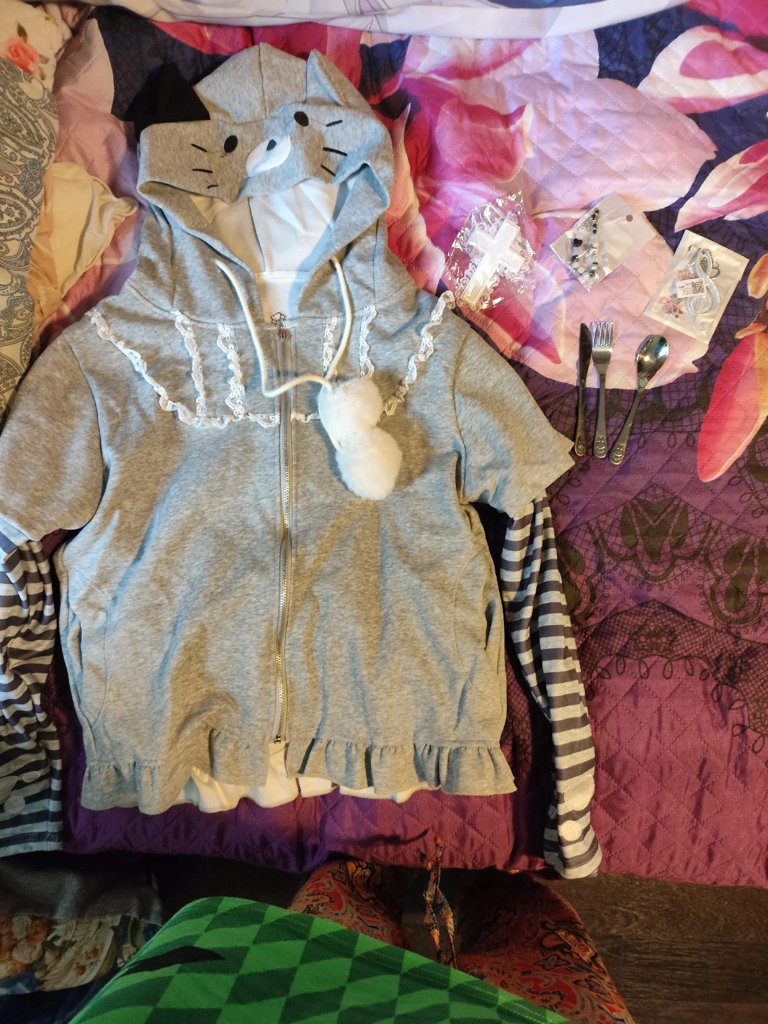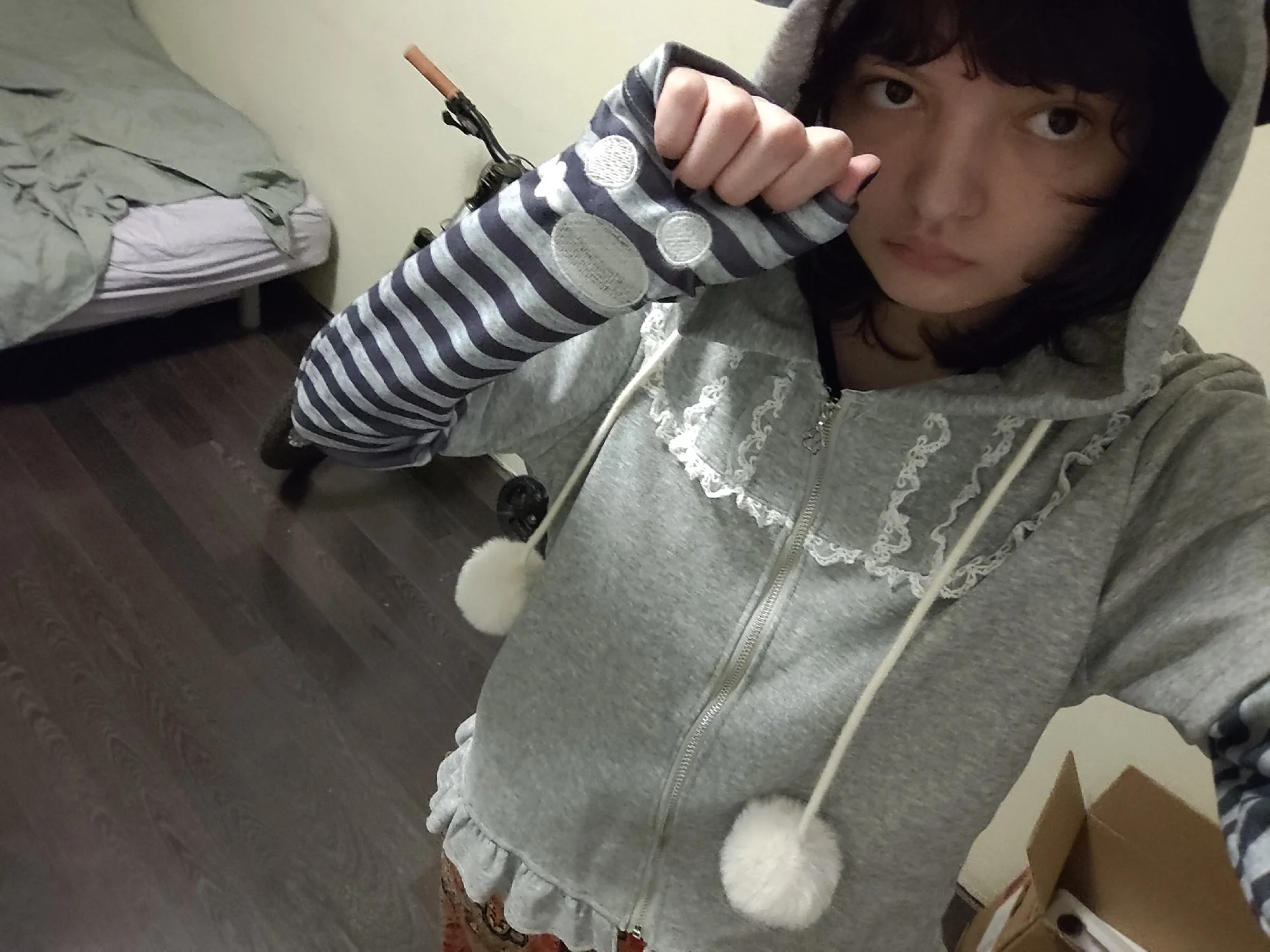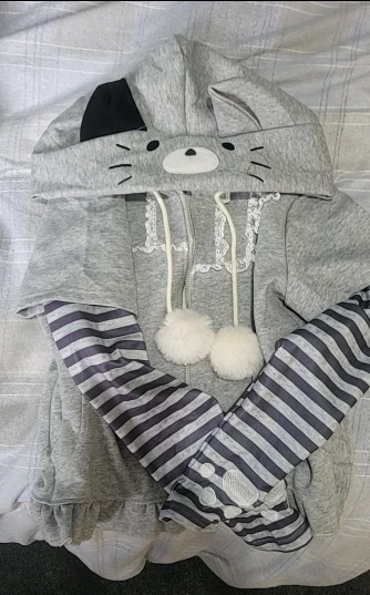 I ordered a size large (i wear size s) because i wanted it loose fitting. The sleeves have holes cut out for the thumbs which are a bit tight. The frills are sewn on well and the detail on the hood (the white part) is fluffy. The only main difference from the image would be the sleeves; they are instead a smooth/soft feel with stripes printed on.