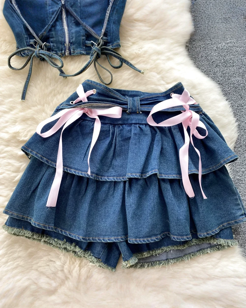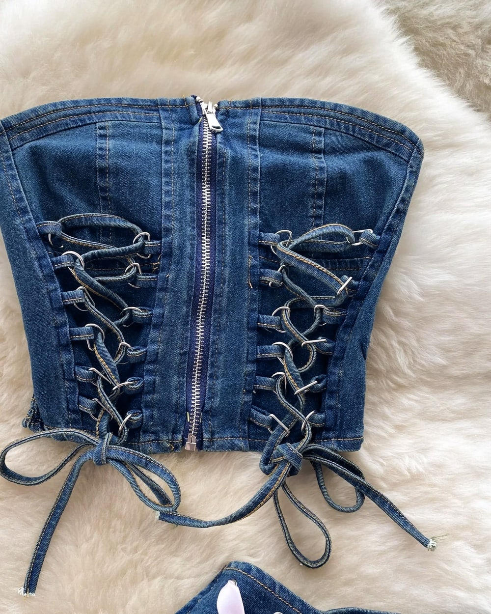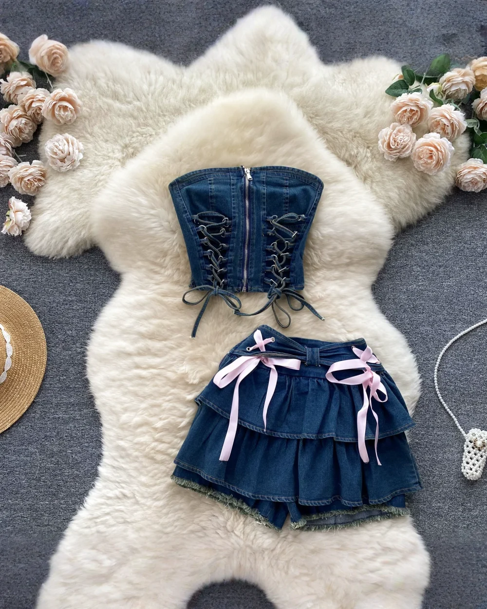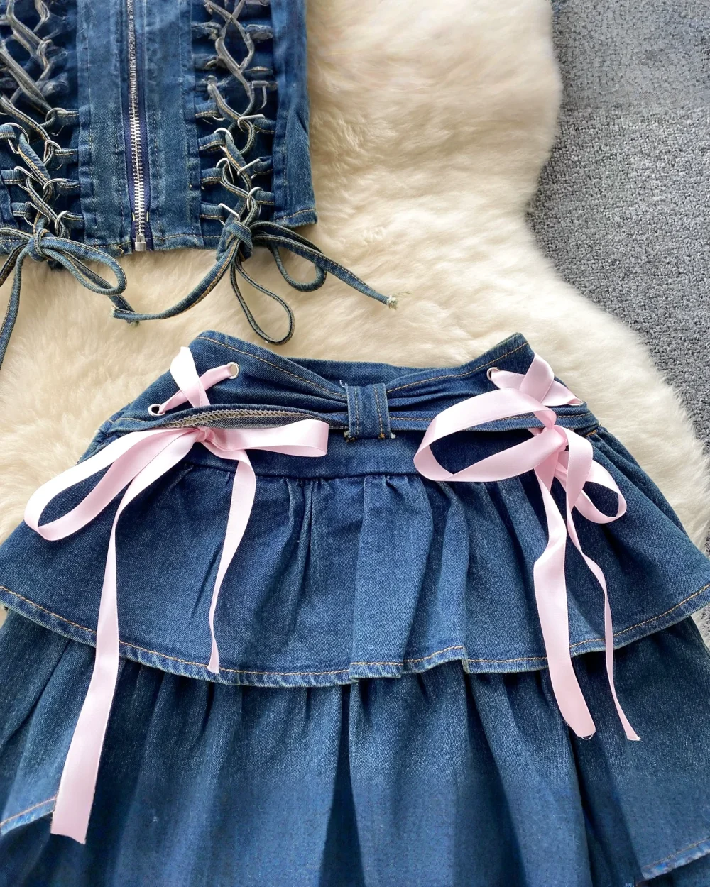 Slip into the Two-Piece Coquette Denim Set and live your best Y2K fantasy! ✨💙(ノ´ヮ`)ノ*: ・゚✧