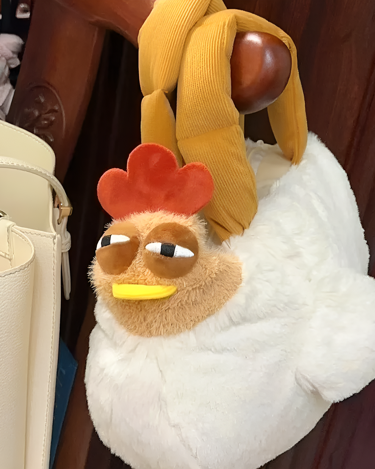 The Ugly Chicken Plush Handbag features hilarious yellow fabric legs that double as handles for your convenience. That deadpan stare is just looking out for your vibe. (¬_¬)