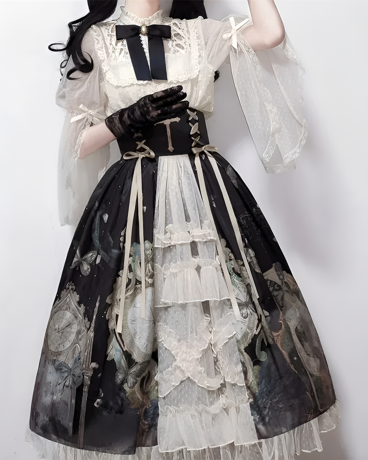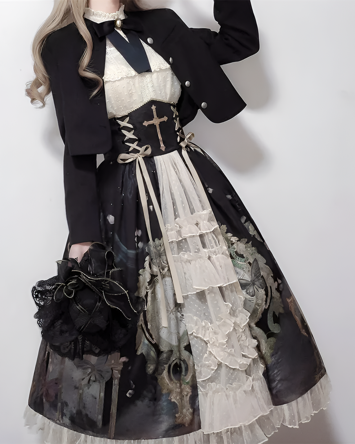 Featuring a cross-embellished vest and layered tulle, this dress delivers that dark academic look you pretend to live. It is basically a wearable library aesthetic for you. ✧