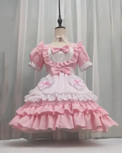 Unisex Japanese Maid Dress - Kawaii Aesthetic, layered pink and white short dress with ruffles.Unisex japanese maid dress in pink and white, kawaii aesthetic, frilled details on the skirt and sleeves.