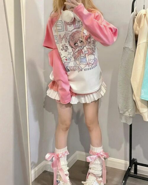 Printed pink kawaii t-shirt featuring a cute anime-style character and "Game Over" design.Pink kawaii t-shirt with a cute anime print, layered with a ruffled skirt and socks.